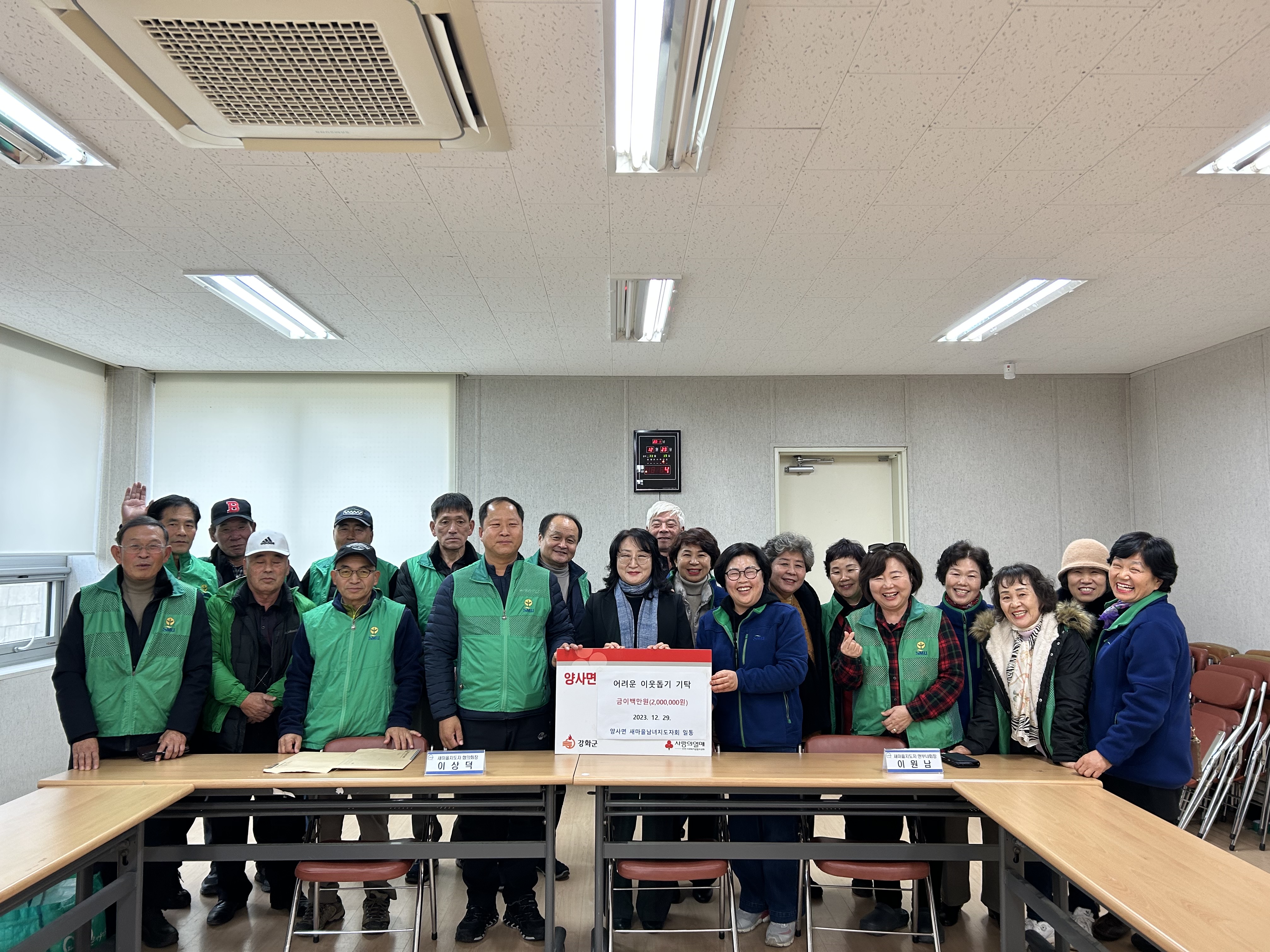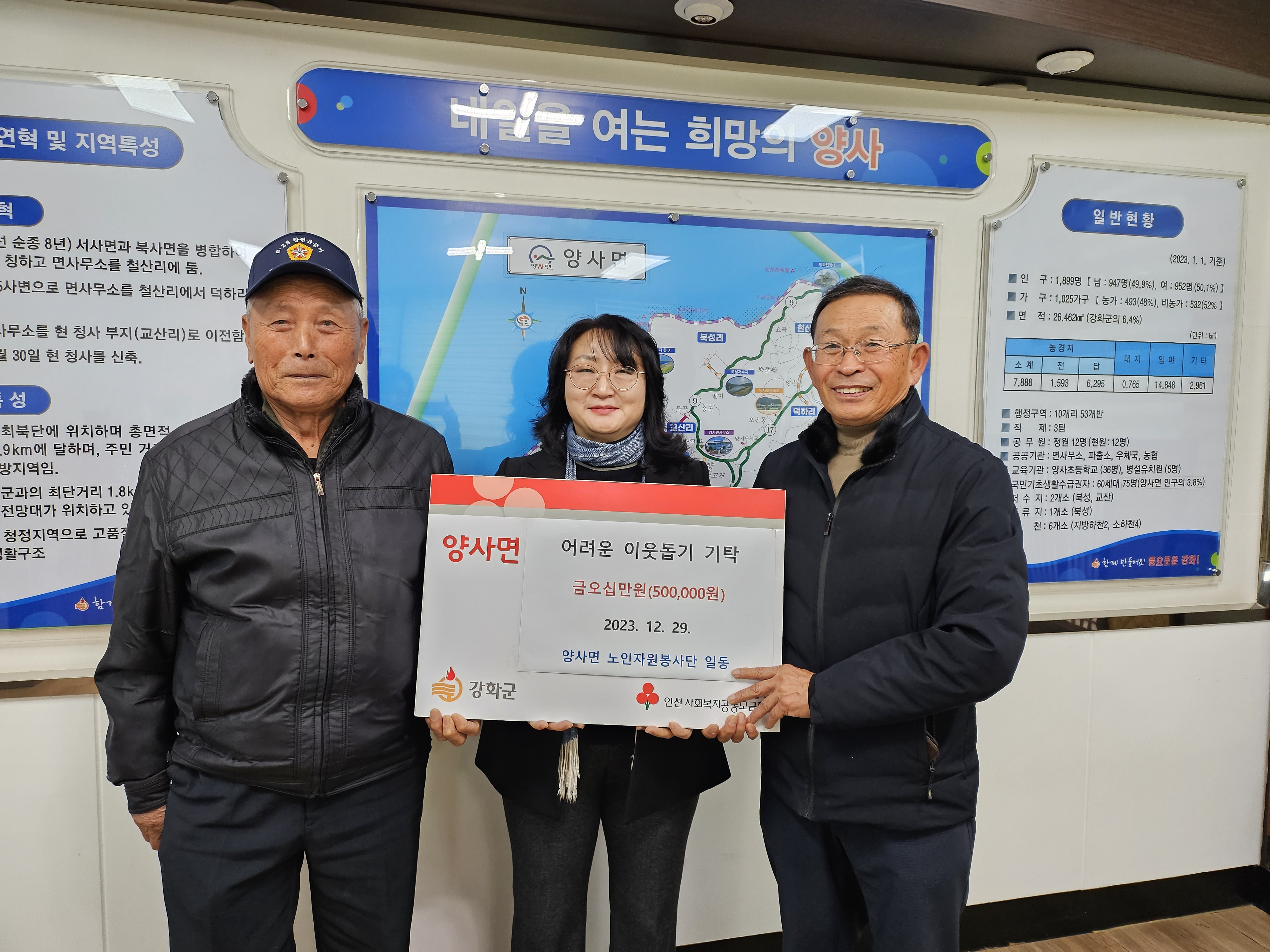 강화군 양사면(면장 이지영)에 이웃을 위한 성금 기탁이 이어지고 있다. 새마을남녀지도자회(회장 이원남, 이상덕)에서 200만 원을, 노인자원봉사단(단장 서영은) 및 적십자부녀봉사회(회장 문상순) 각각 50만 원을 인천 사회복지공동모금회를 통해 양사면에 지정 기탁했다. 이 단체는 어르신 위문품 전달과 반찬 지원 등 다양한 봉사활동에 적극 참여하고 있다.