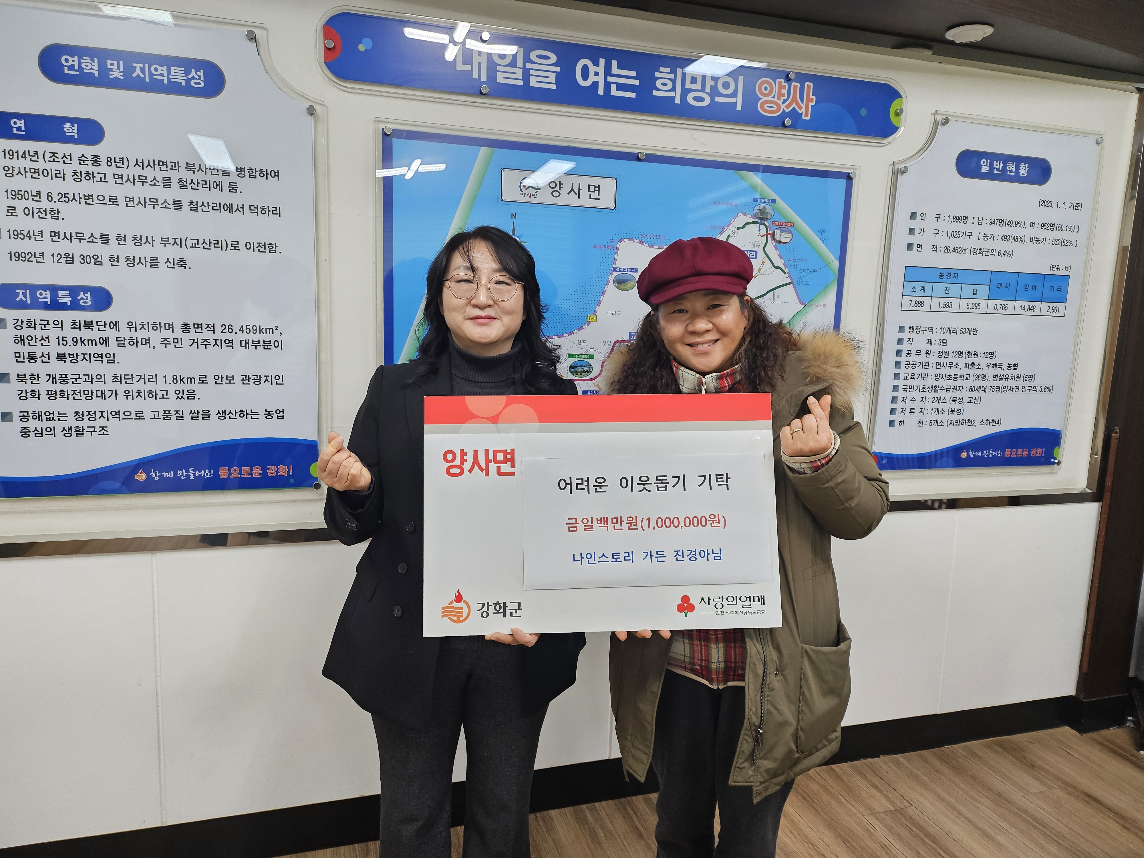 강화군 양사면 나인스토리가든 대표 진경아 님이 지난 4일 양사면사무소에 성금 1백만 원을 기탁해 지역사회에 훈훈한 감동을 주고 있다.