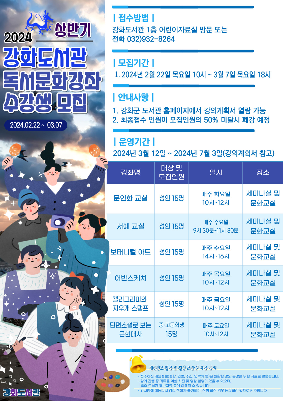 먼저, 강화 도서관에서는 성인을 대상으로 ‘문인화 교실’, ‘서예 교실’, ‘보태니컬 아트’ 등의 수업이 진행되며, 중‧고등학생을 대상으로 하는 ‘단편소설로 보는 근현대사’도 운영된다.