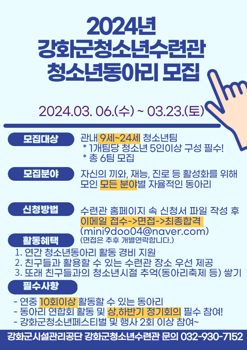 더 자세한 내용은 강화군시설관리공단 홈페이지(www.ghss.or.kr)를 확인하거나, 청소년수련관(☎032-930-7152)으로 문의하면 된다.