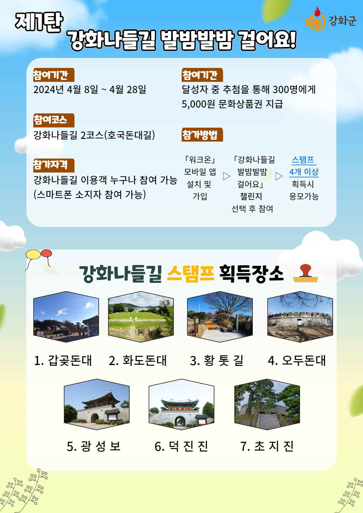 4월 첫 챌린지 구간은 강화 나들길 2코스(호국돈대길)가 선정됐다. 호국돈대길은 나라를 지키기 위해 세운 갑곶돈대, 화도돈대, 오두돈대, 광성보, 덕진진, 용진진 등 민족의 호국정신과 국난 극복 정신을 마주할 수 있는 코스로, 나들길을 걷다 보면 다양한 봄꽃 풍경을 보며 봄의 시작도 느낄 수 있다.