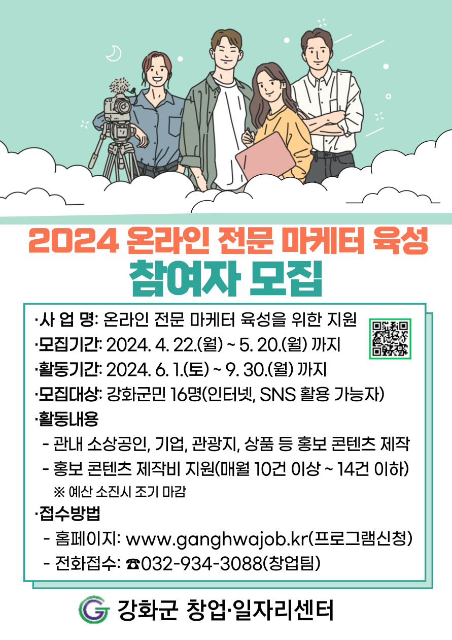 강화군 창업·일자리센터(센터장 윤정혁)가 오는 5월 20일까지 온라인 전문 마케터 육성 교육 참여자를 모집한다.