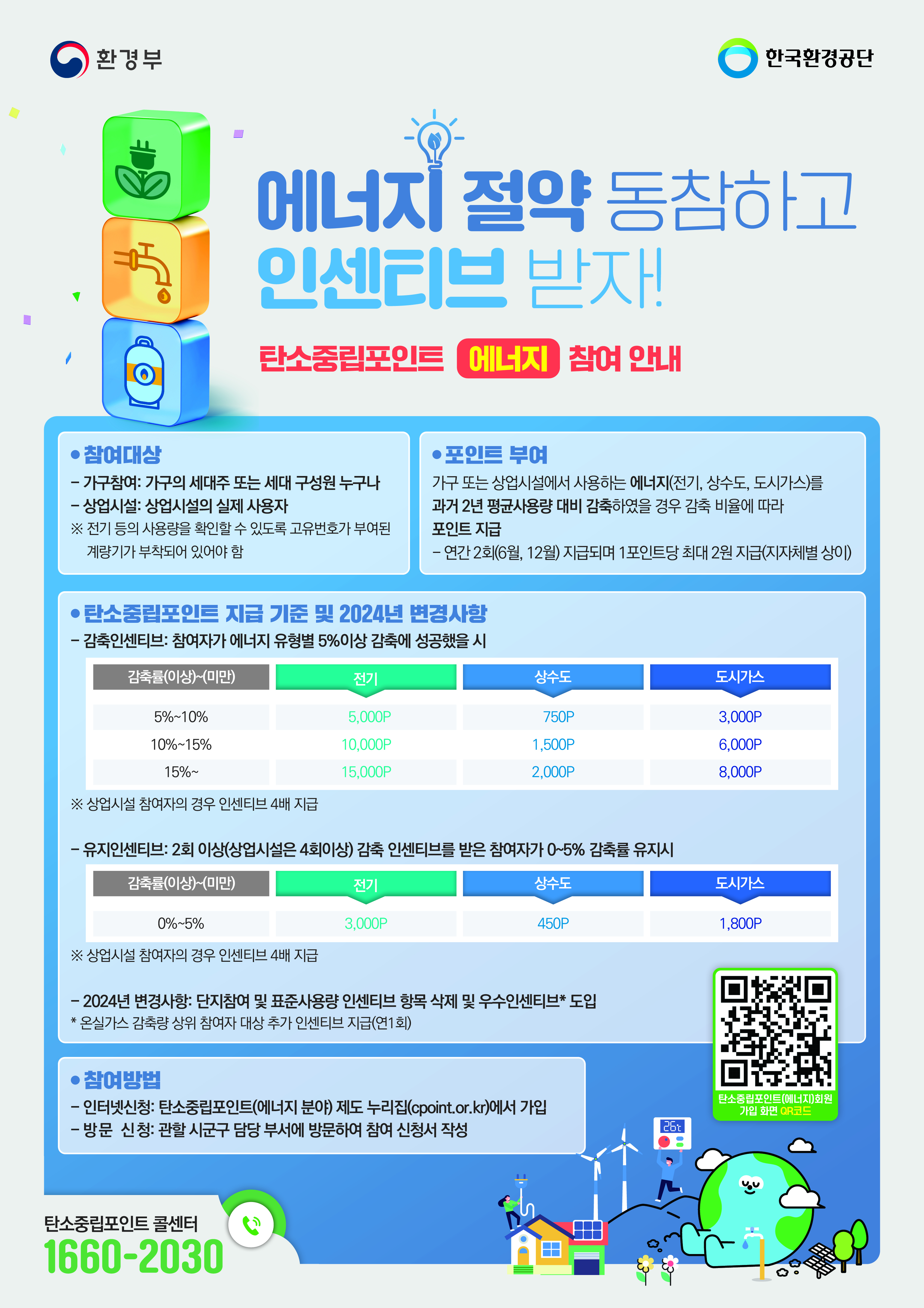‘탄소중립포인트제’는 가정․상업시설․아파트 단지 등에서 전기‧상수도‧도시가스 등 에너지 사용량 절감 실적에 따라 온실가스 감축률에 상응하는 인센티브를 제공하는 범국민 온실가스 감축 실천 프로그램이다.