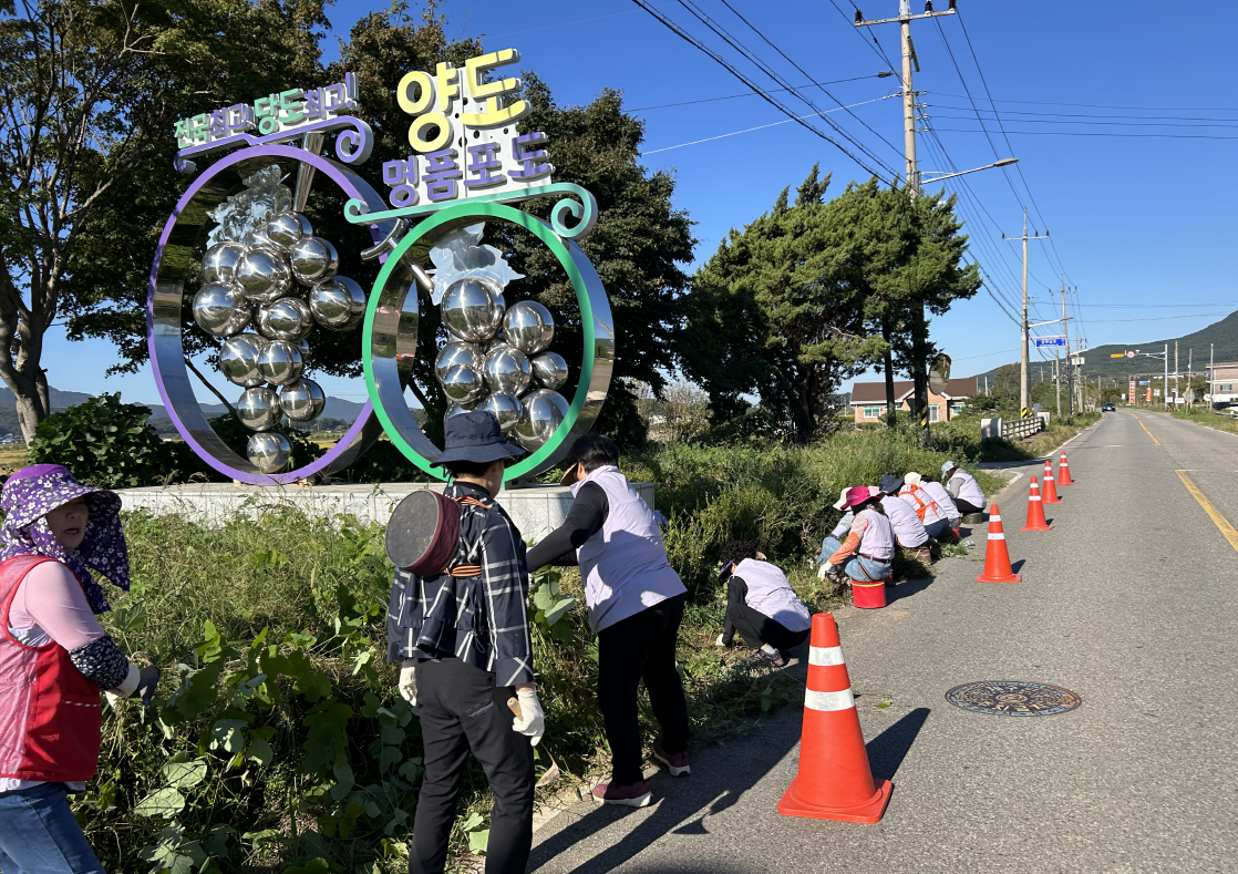 이날 회원 18명은 이른 아침부터 길정리 포도 조형물 앞에 모여 가로화단 풀매기 작업과 생활 쓰레기 등을 수거하며 구슬땀을 흘렸다.