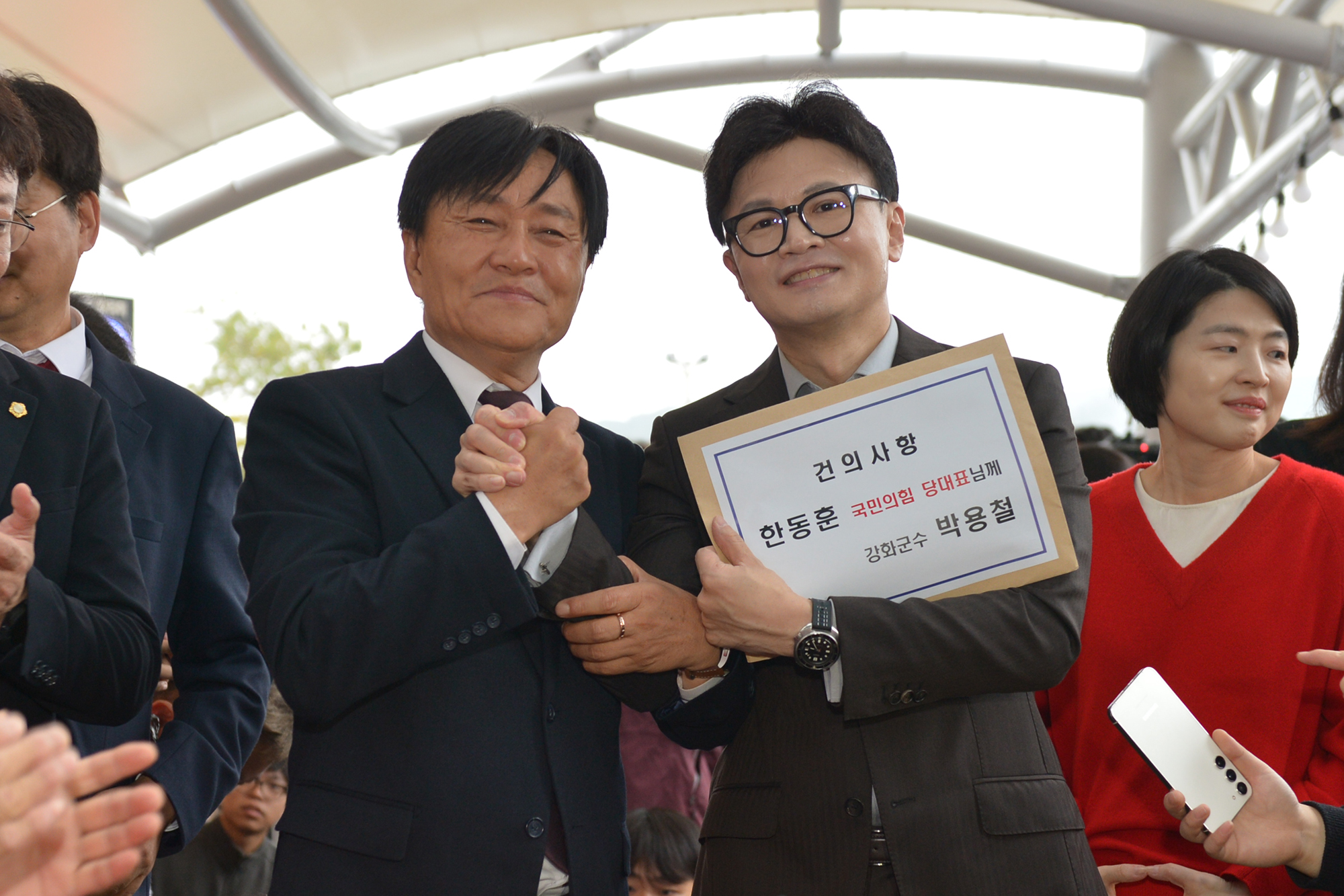 박용철 강화군수는 22일 오후 3시 강화 풍물시장을 찾은 국민의힘 한동훈 대표를 만나 군 현안사업을 설명하고 강화군 발전을 위한 건의사항을 전달했다.