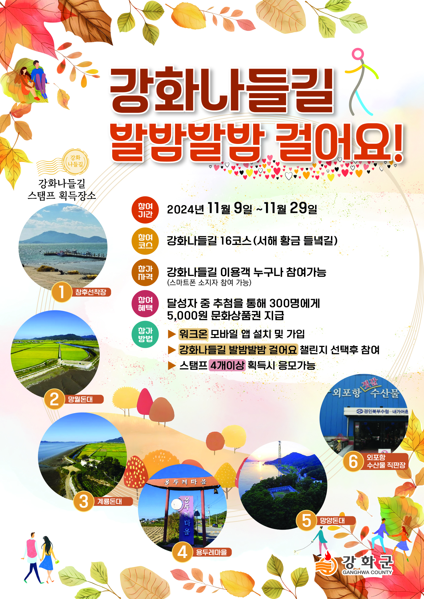 올해 마지막으로 진행되는 이번 챌린지 구간은 강화나들길 16코스 ‘서해 황금 들녘길’을 선정했다.