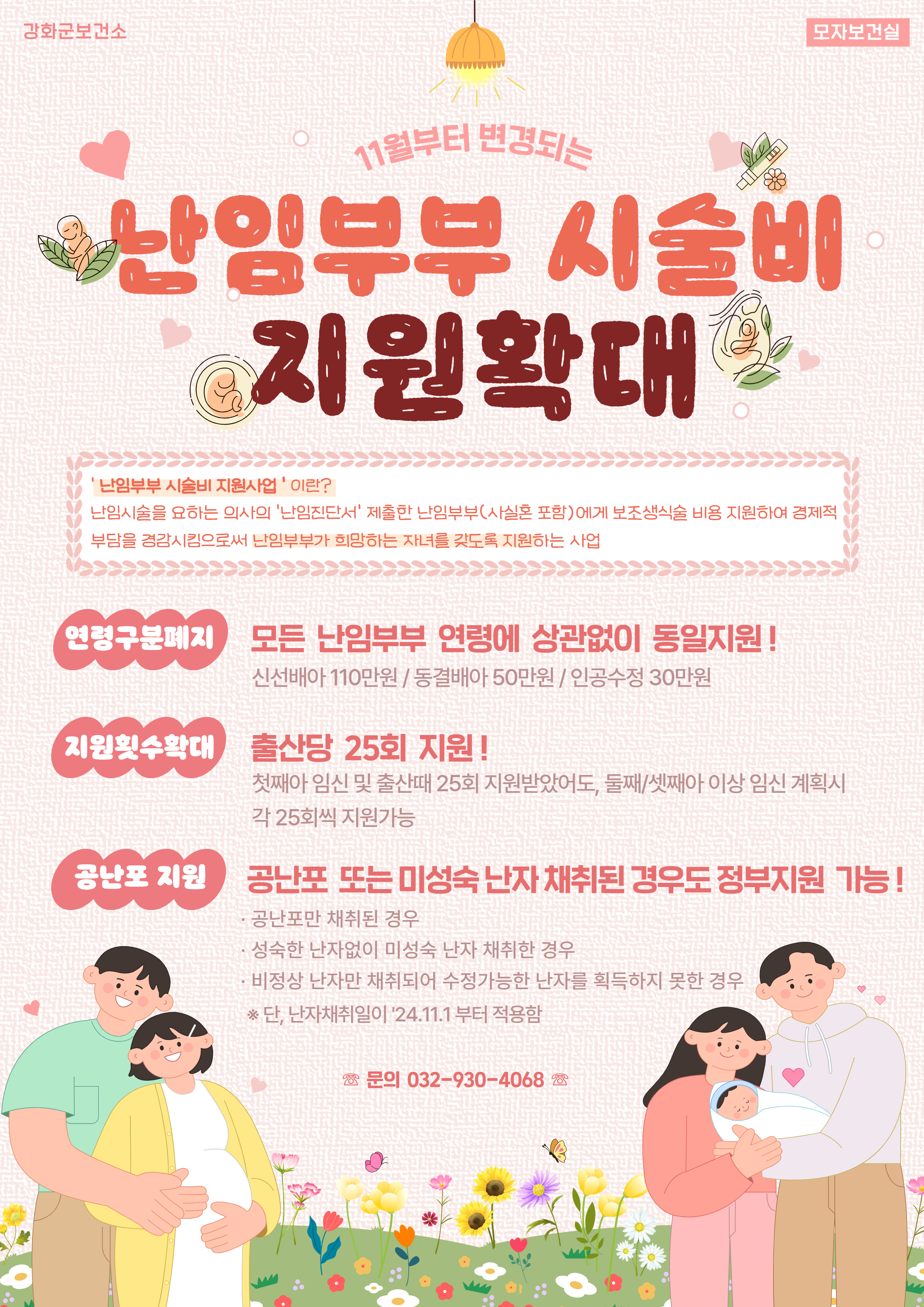 박용철 강화군수는 “이번 난임 시술비 지원 확대로 난임 가정의 경제적 부담이 완화되길 바라며, 더 나은 임신·출산환경 마련을 위해 앞장서겠다”고 말했다.