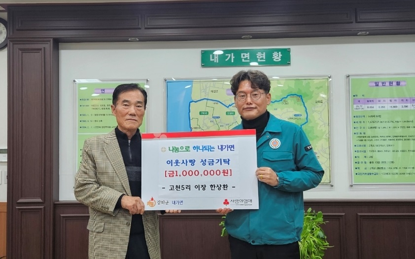 차은석 내가면장은 “경기가 어려운 요즘 연말을 맞이해 지역사회 복지에 관심을 가지고 나눔에 동참해 주신 고천 5리 한상환 이장님께 감사드리며, 이를 계기로 이웃의 정을 나누는 문화가 더욱 확산될 수 있도록 노력하겠다”고 말했다.
