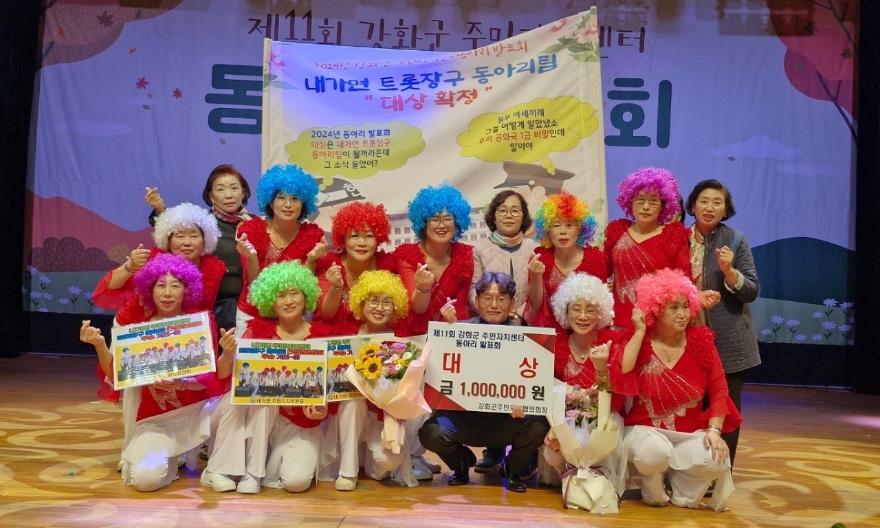 강화군 내가면 트롯장구 동아리(회장 임인숙) ‘멋진 인생’은 지난 14일 제11회 강화군 주민자치센터 동아리 발표회에서 우수 동아리 대상 상금으로 받은 일백만 원 전액을 어려운 이웃들을 위해 써달라며 기부했다.