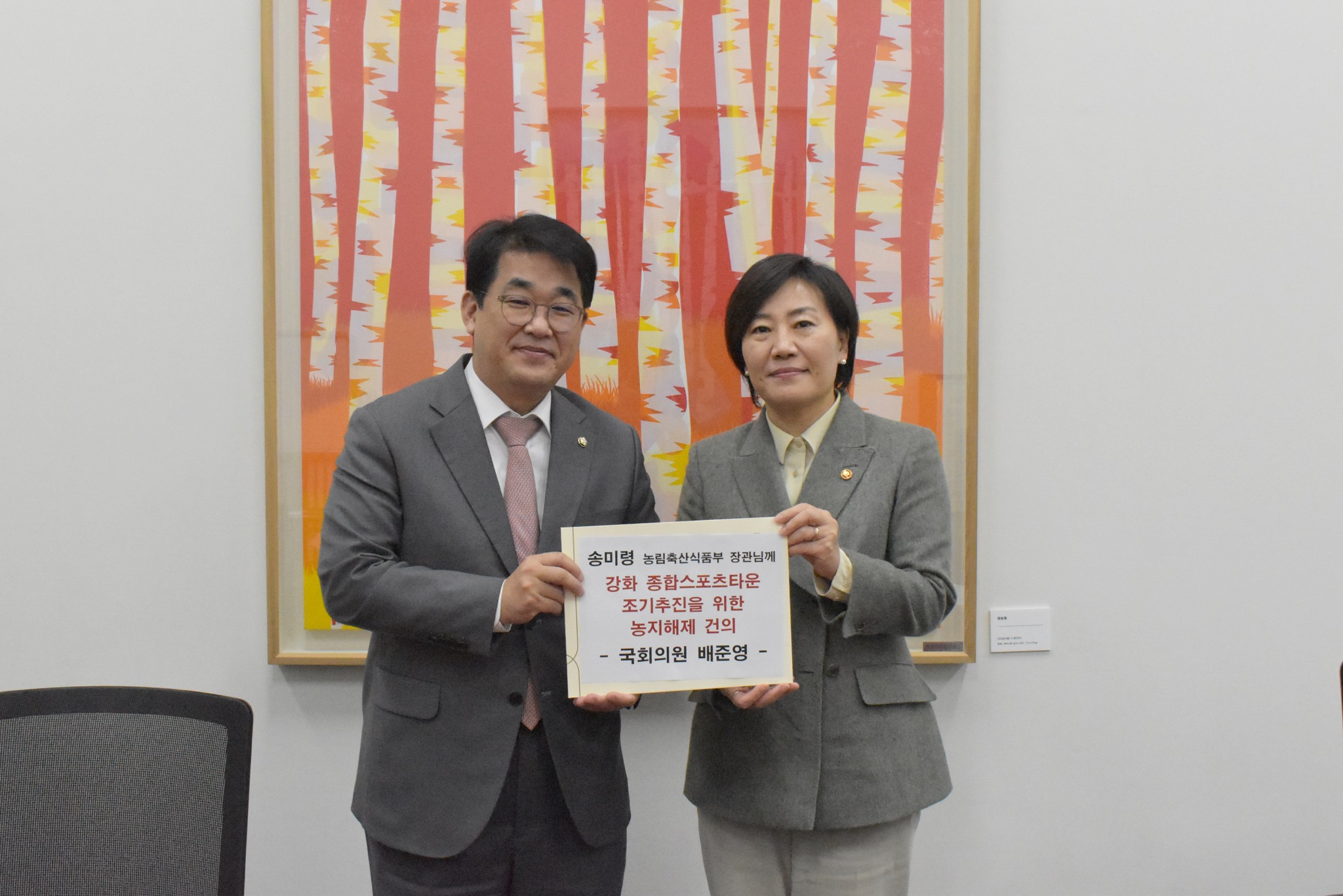 강화군(군수 박용철)은 11월 28일 민선 10기 핵심 공약인 ‘강화군 종합 스포츠타운 조성사업’의 성공적 추진을 위해 배준영 국회의원실을 찾아 현안을 협의했다. 배준영 의원은 이날 바로 송미령 농림축산식품부 장관을 만나‘농업진흥지역 해제’를 요청해 사업 추진에 탄력을 받을 전망이다.