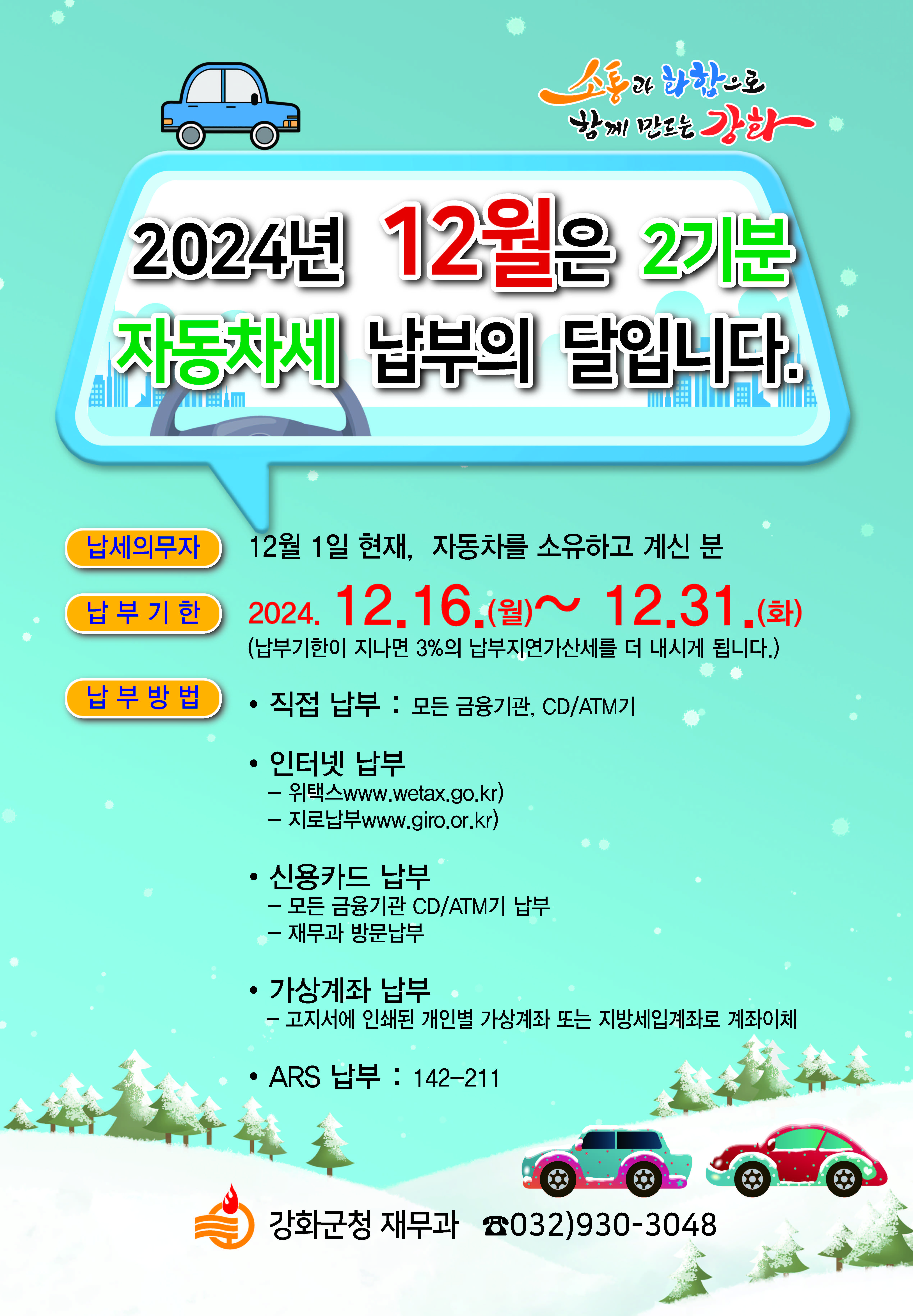 강화군(군수 박용철)은 2024년도 제2기분 자동차세 16,623건, 26억5천만원을 부과하고, 기한 내 납부를 당부했다.