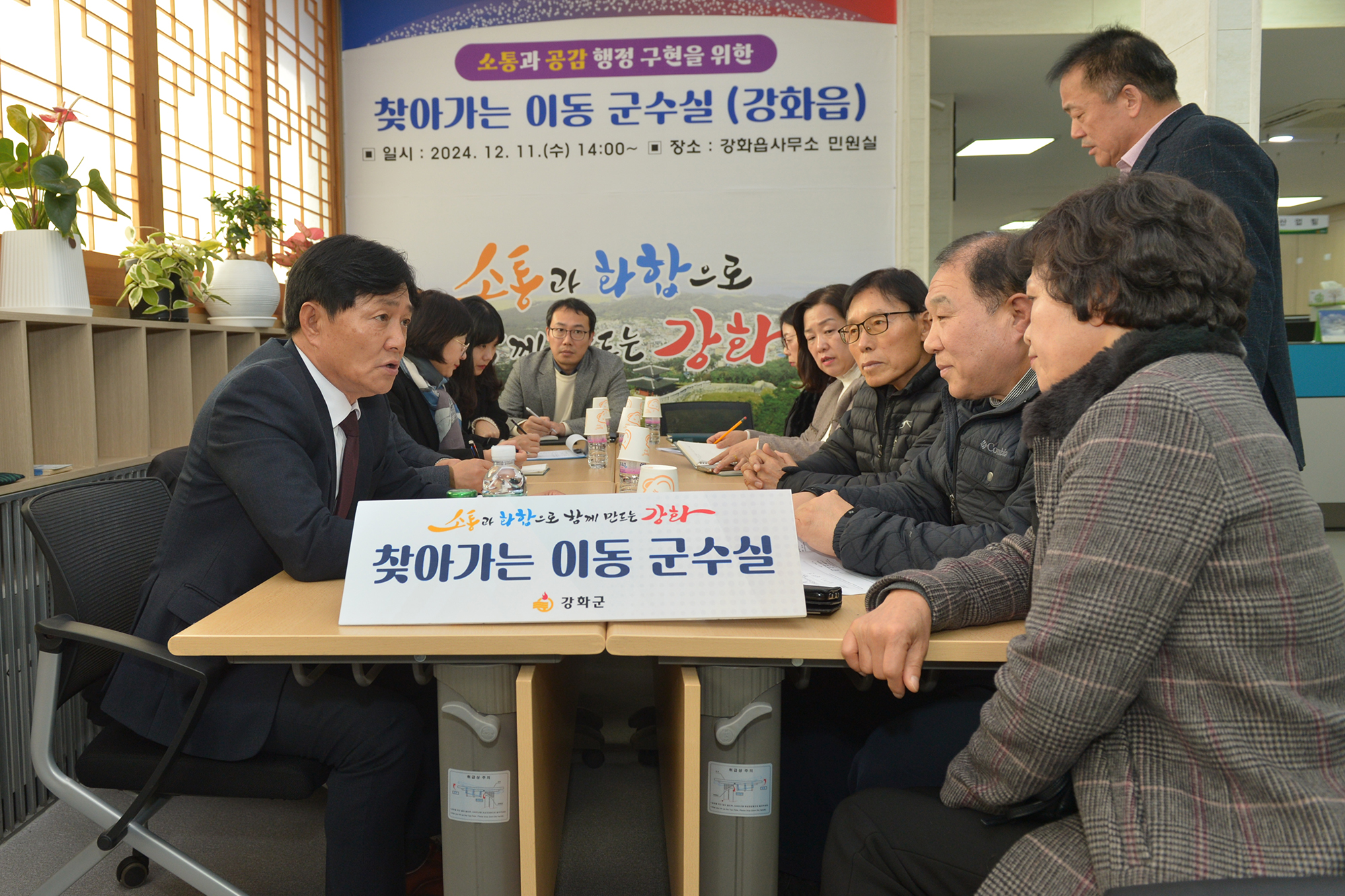 이날 10여 명의 강화읍사무소를 방문한 민원인들은 개인적인 고충에 대해 군수와 격의 없는 대화를 나누고, 도시가스 공급 확대, 경로당 신축 등 마을숙원사업에 대해서도 건의했다. 강화군청 관련 팀장들도 함께 배석하여 현장에서 바로 해결할 수 있는 경미한 문제들은 바로바로 처리 방안을 안내하는 모습도 보였다.