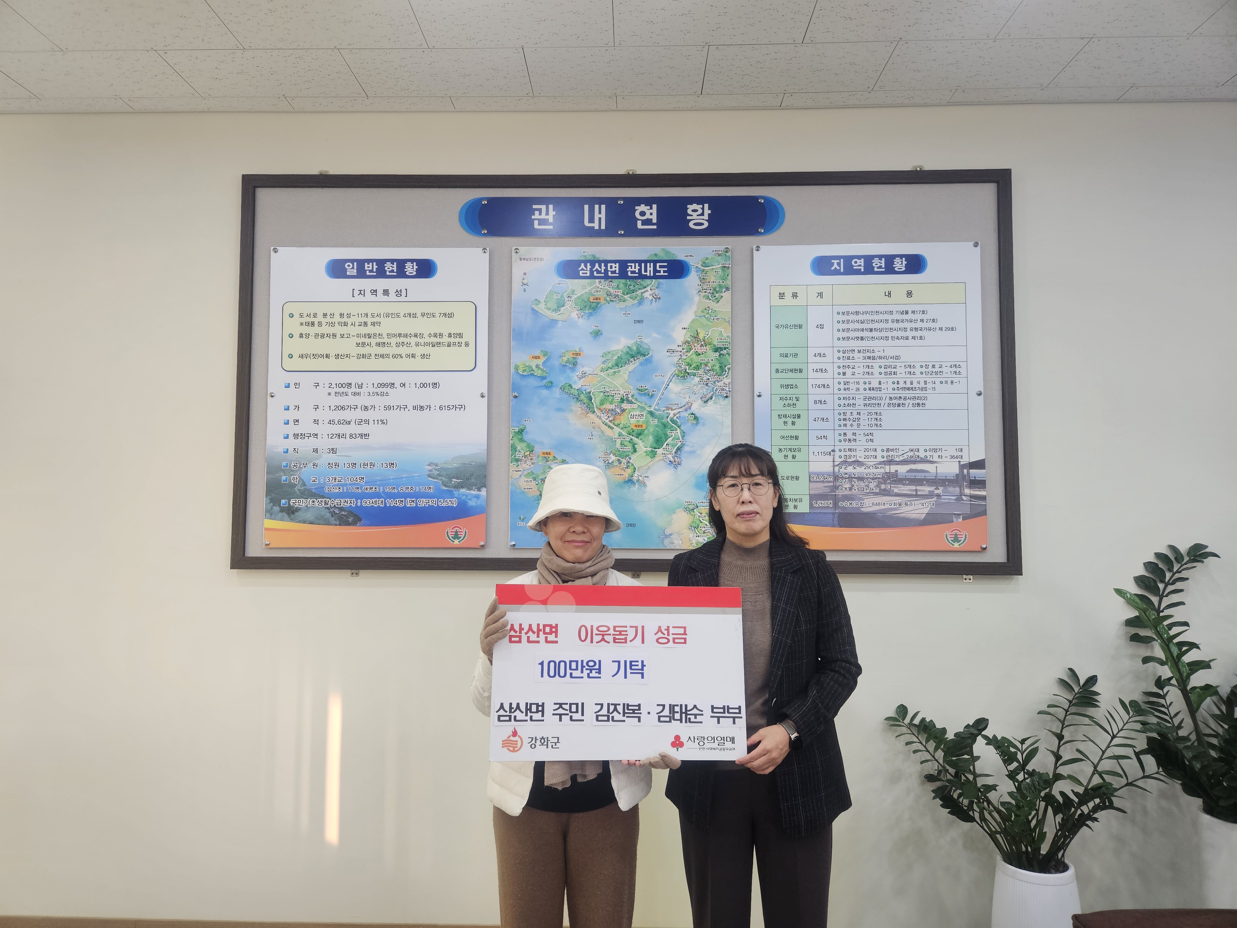 강화군 삼산면(면장 김은희)은 지난 9일 삼산면 주민인 김진복·김태순 부부로부터 어려운 이웃을 위해 써달라며 성금 100만 원을 기탁받았다.