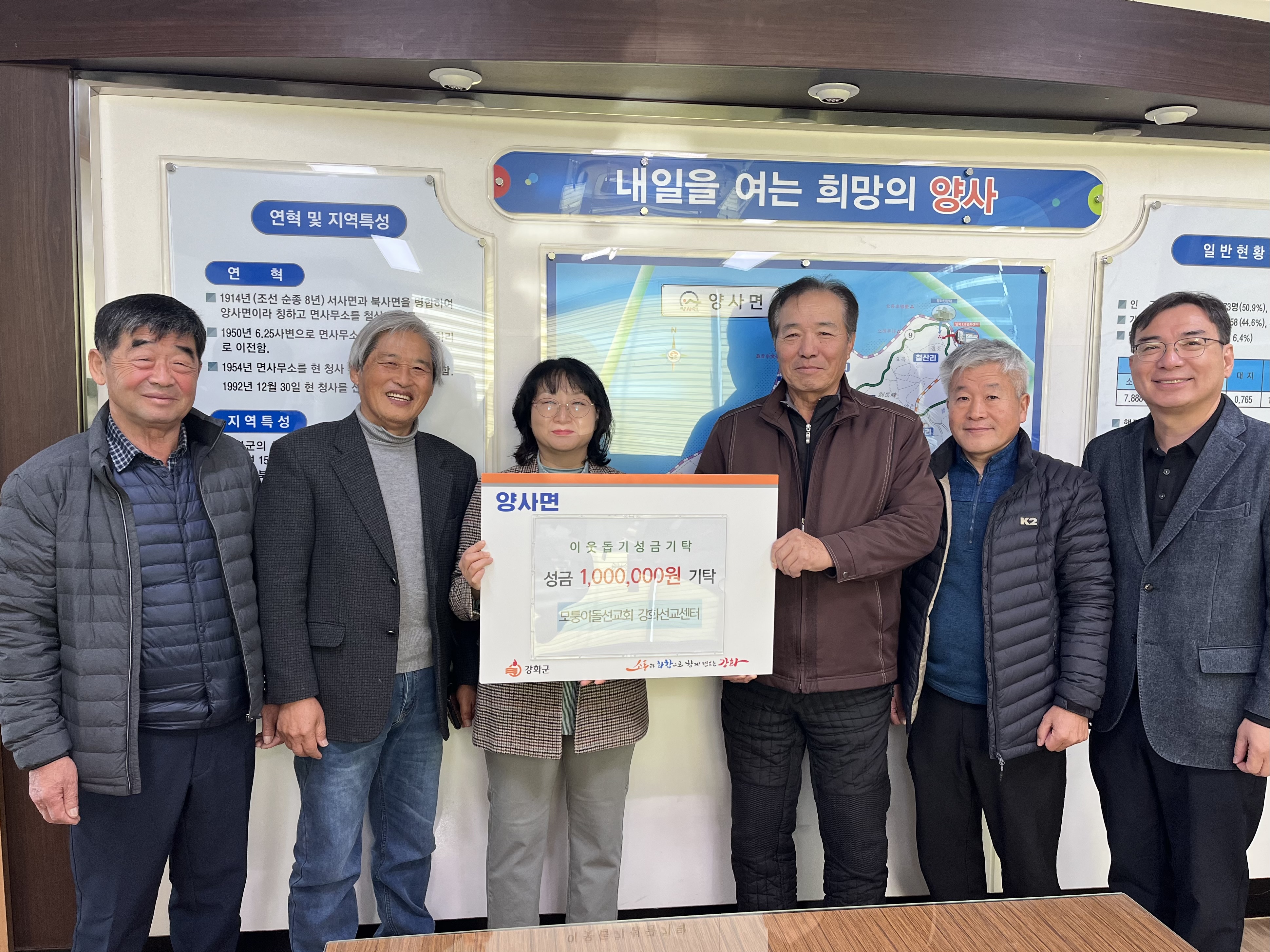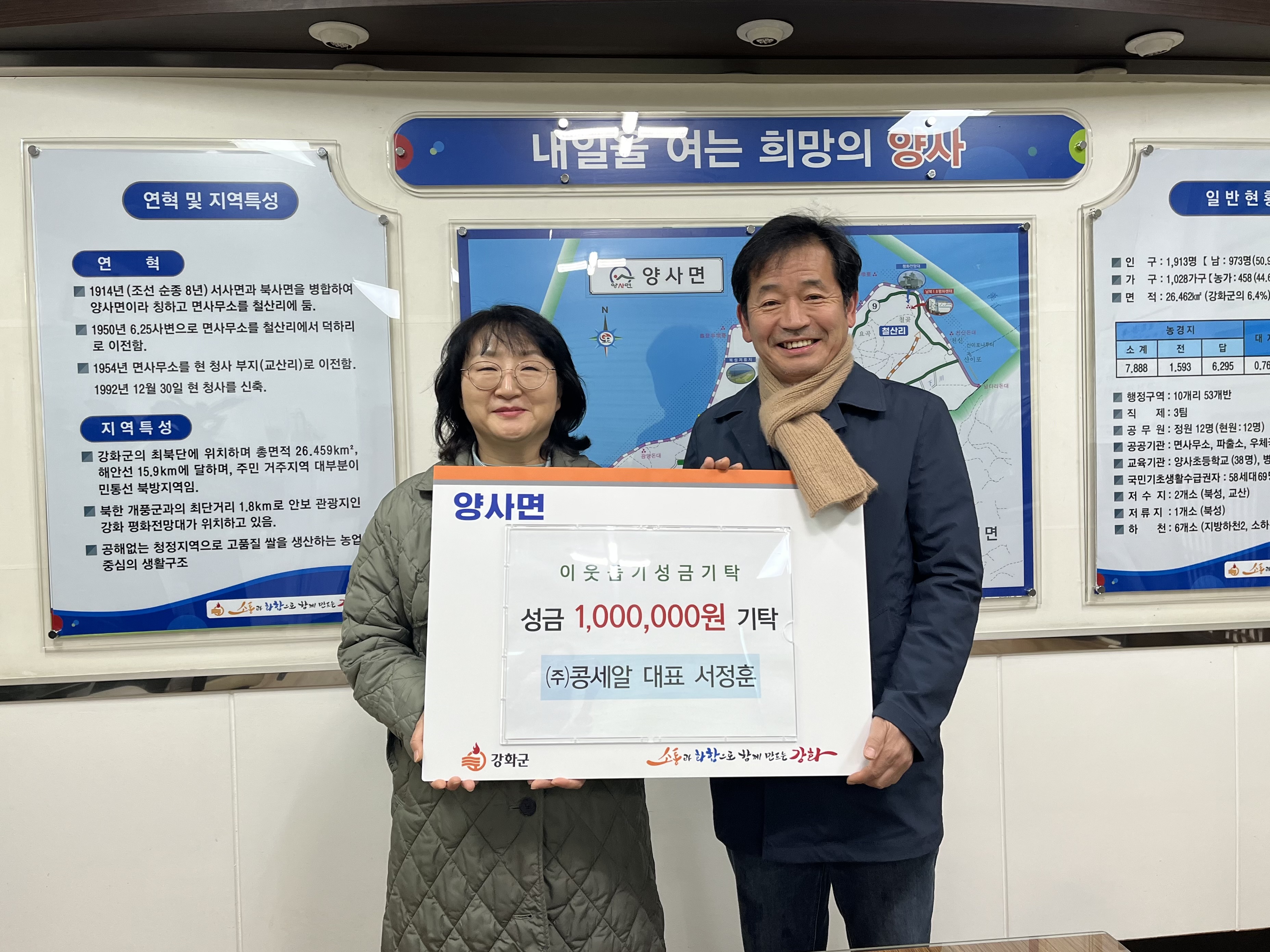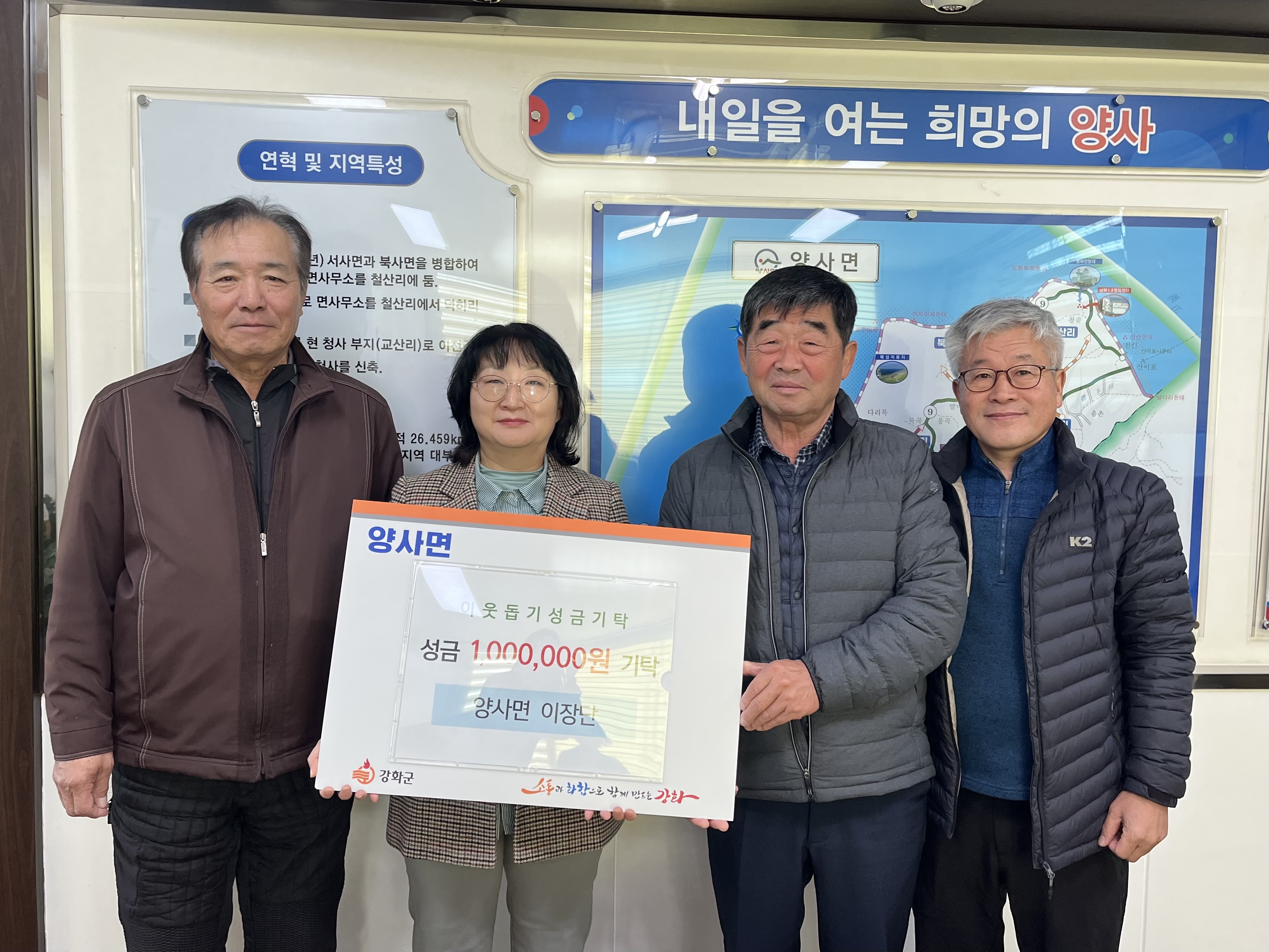 강화군 양사면(면장 이지영)은 지난 11일 양사면 이장단(단장 한종서) 및 농업회사법인(주)콩세알(대표 서정훈), 모퉁이돌선교회(목사 순병기)에서 각각 100만 원을 사회복지공동모금회를 통해 양사면에 지정 기탁받았다고 밝혔다.