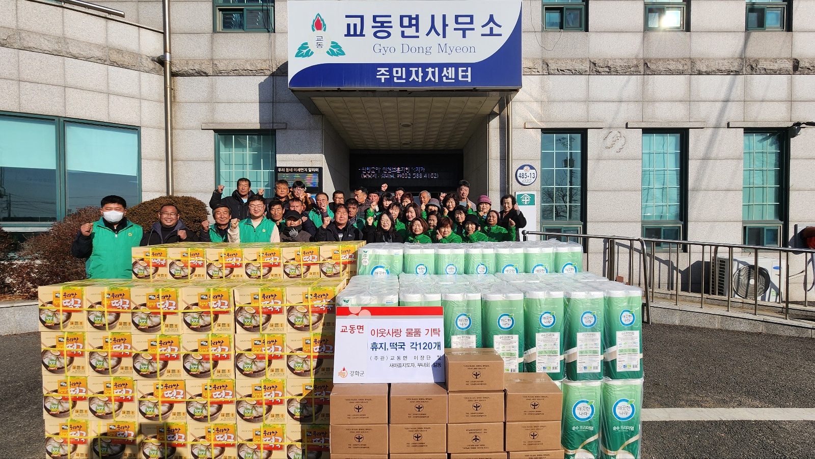 이번 행사에는 교동면 이장단(단장 김형태)을 비롯하여 새마을지도자(회장 임달호), 새마을부녀회(회장 나인숙)가 참여했으며, 떡국과 화장지 각 120 상자를 함께 준비해 관내 취약계층 가정에 직접 전달했다.