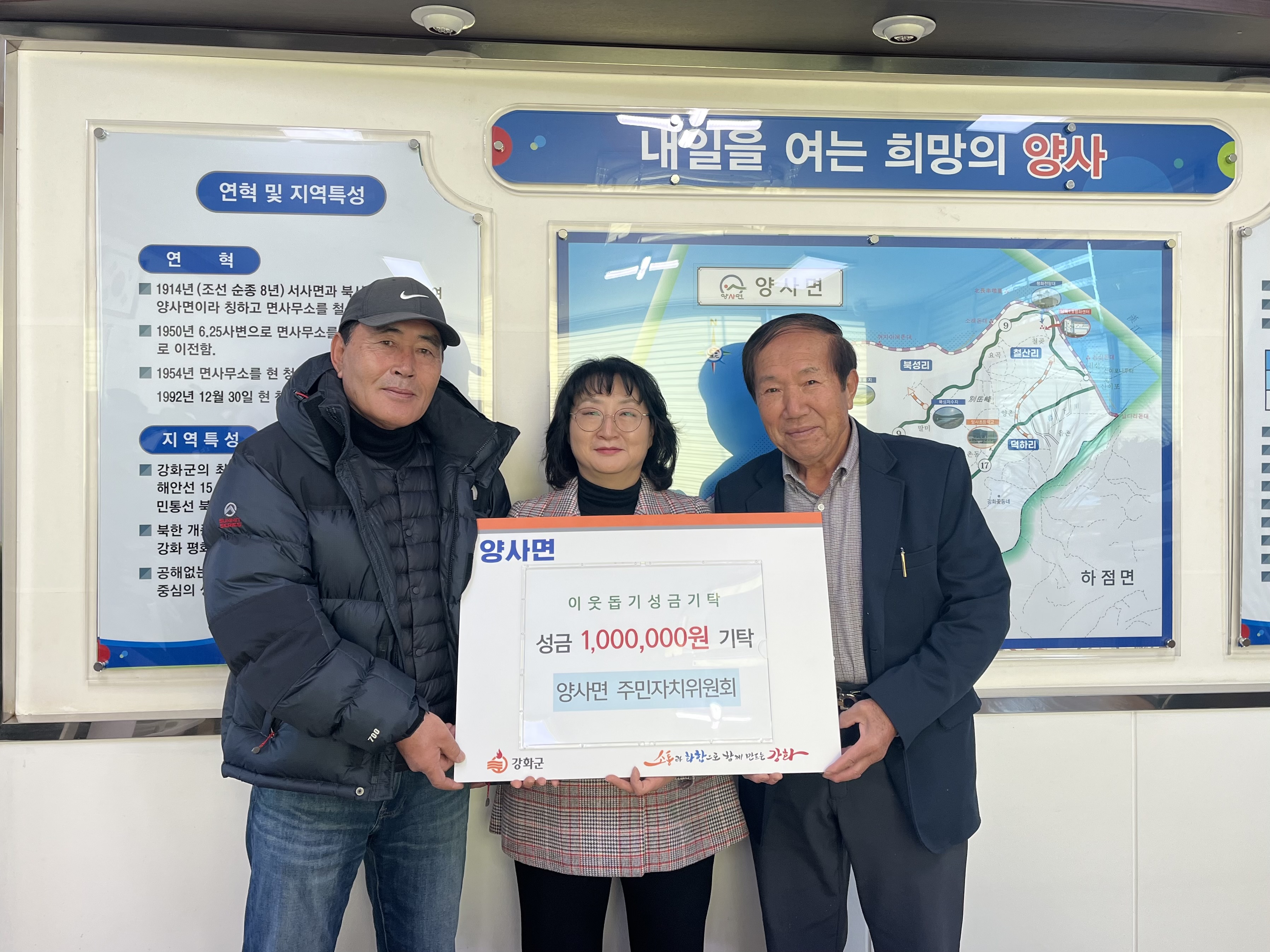 강화군 양사면(면장 이지영)에 관내 어려운 이웃을 돕기 위한 기부 행렬이 이어지고 있다. 지난 13일부터 19일까지 양사면 인화 1리 주민 일동을 비롯한 양사면 단체들이 사회복지공동모금회를 통해 성금을 기탁하며 뜻깊은 기부의 손길을 전했다.