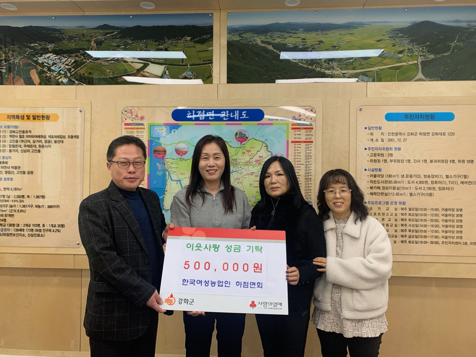 강화군 한국여성농업인 하점면회(회장 서영순)는 지난 13일 하점면사무소를 방문해 설을 맞이한 이웃 돕기 성금 50만 원을 기탁했다.