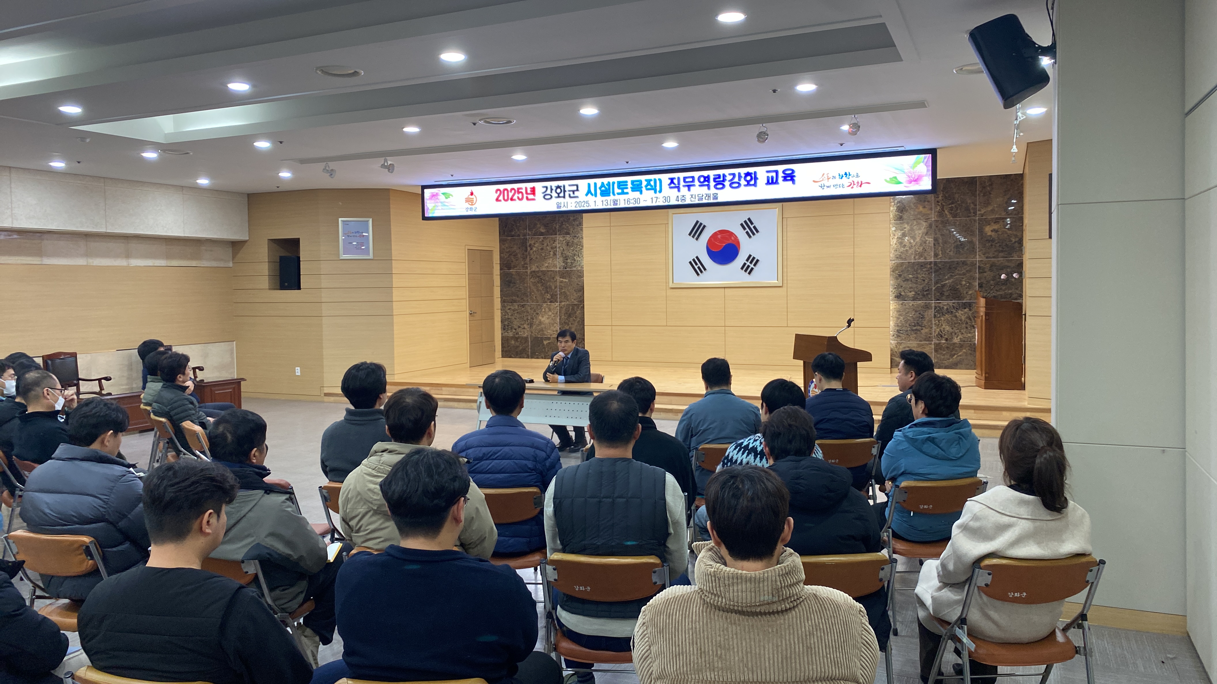 강화군(군수 박용철)은 지난 13일 군청 진달래홀에서 토목직 공무원 전체를 대상으로 직무역량 강화 교육을 실시했다.