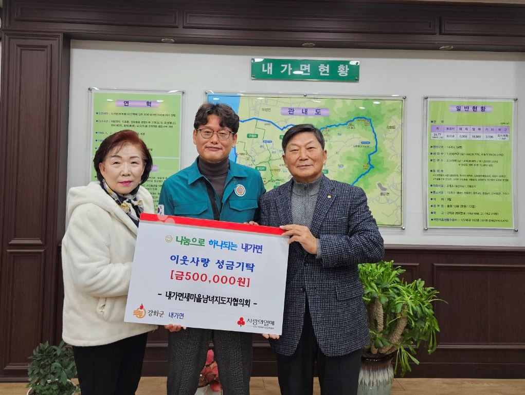 강화군 내가면(면장 차은석)은 지난 21일 내가면 새마을남녀지도자협의회(협의회장 김명희, 부녀회장 김현자)로부터 어려운 이웃을 위해 써달라며 성금 50만 원을 기탁받았다고 전했다.