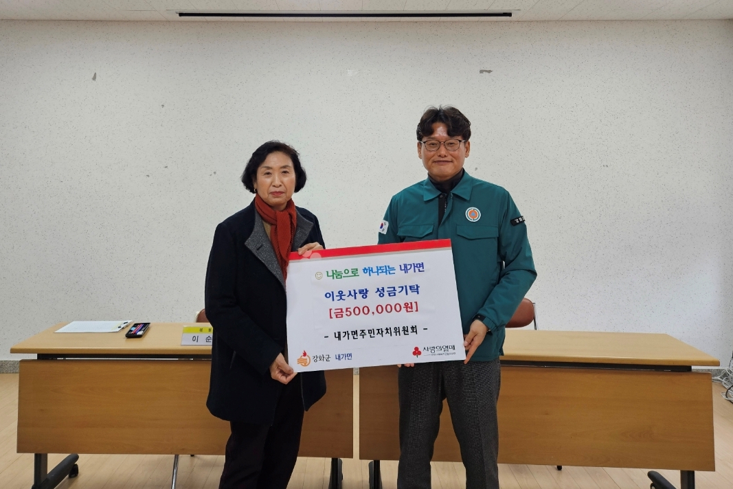 강화군 내가면(면장 차은석)은 지난 21일 주민자치위원회(위원장 이순애)로부터 설 명절을 맞아 어려운 이웃들을 위한 이웃 돕기 성금 50만 원을 기탁받았다고 전했다.