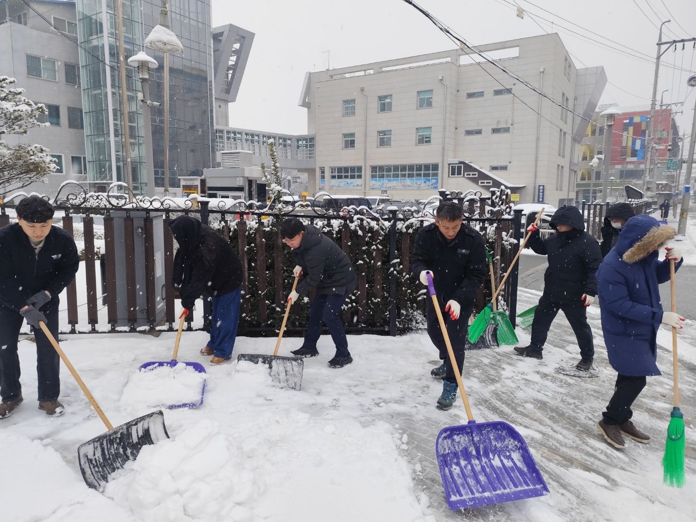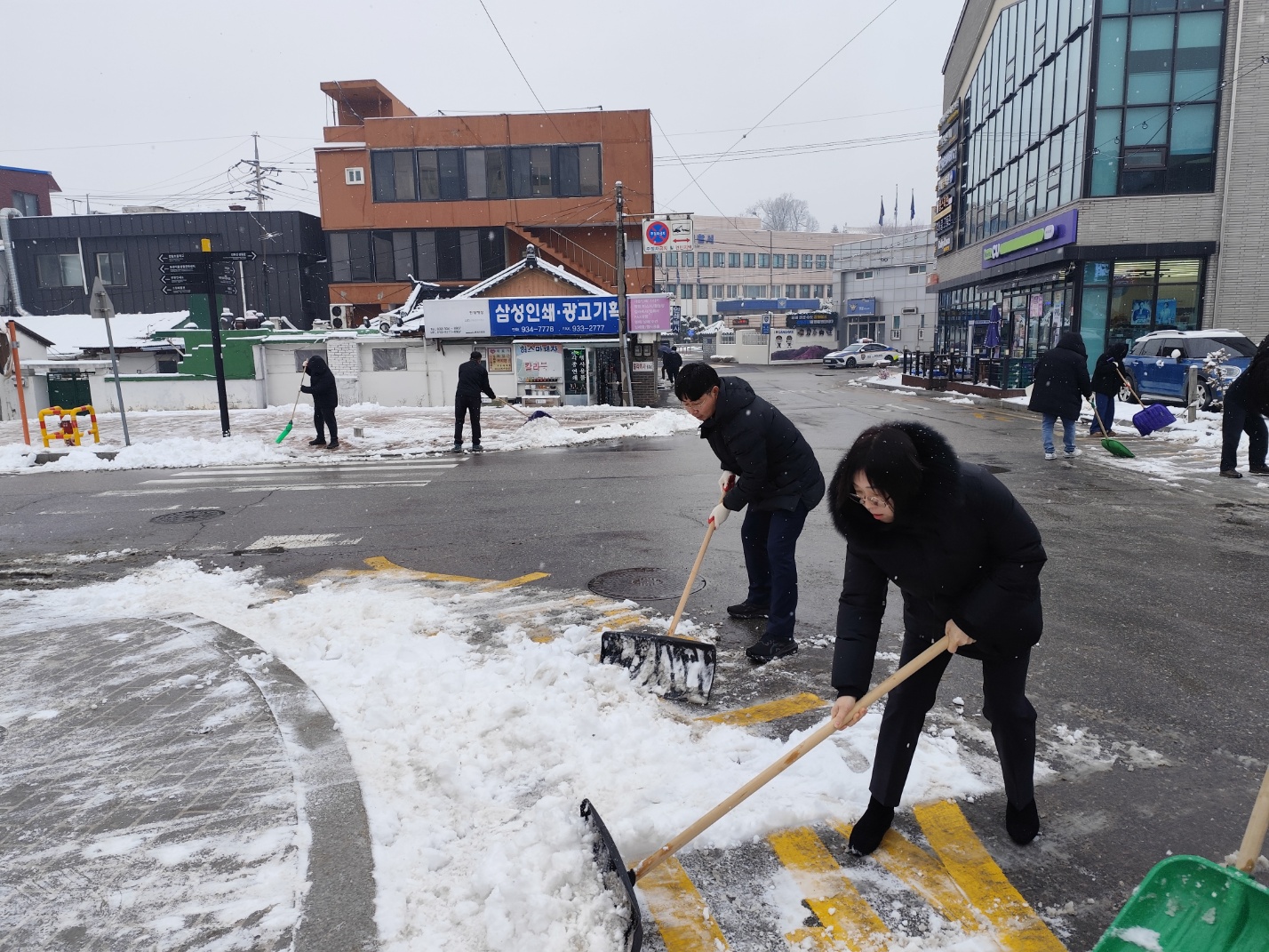 주민 통행 많은 주요 인도에서 눈삽으로 제설작업