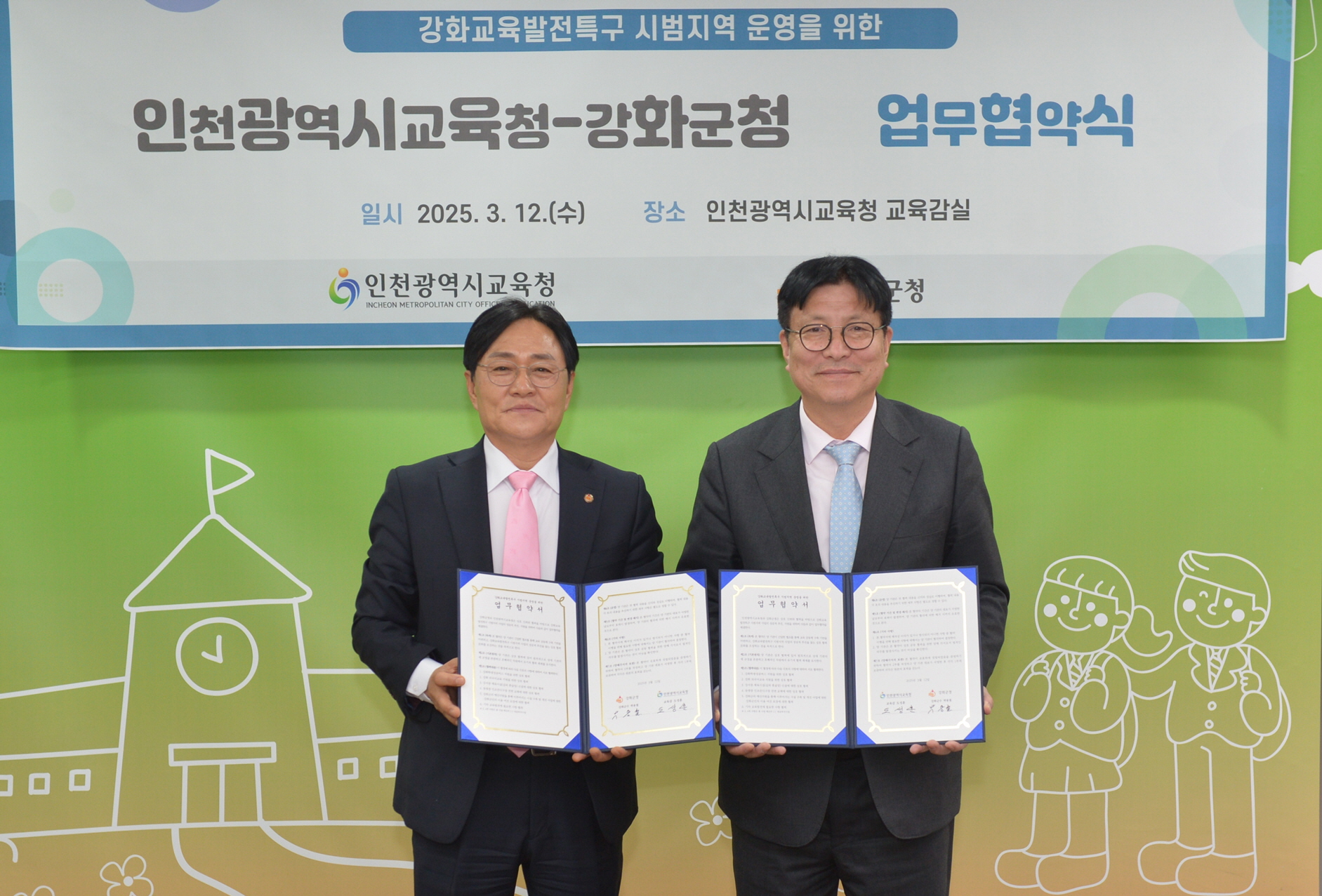 인천광역시교육청 교육감실에서 12일 개최된 협약식에서는 박용철 강화군수와 도성훈 인천시교육감이 강화군 학생들의 교육여건 개선과 인프라 확충을 위한 협력을 약속했다.