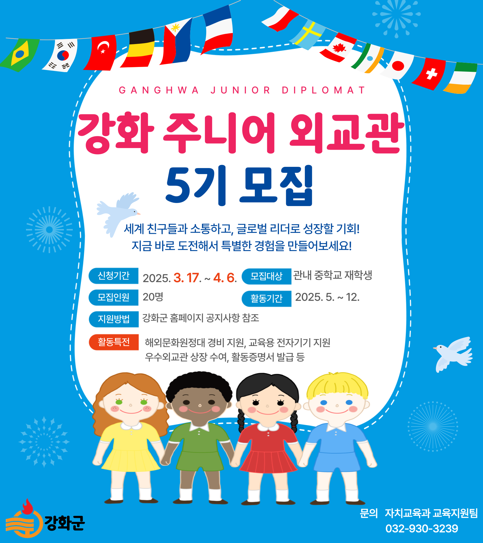 강화군(군수 박용철)이 차세대 글로벌 인재를 양성하기 위한 청소년 국제교류 프로그램 ‘강화 주니어 외교관’ 5기를 오는 4월 6일까지 공개 모집한다.