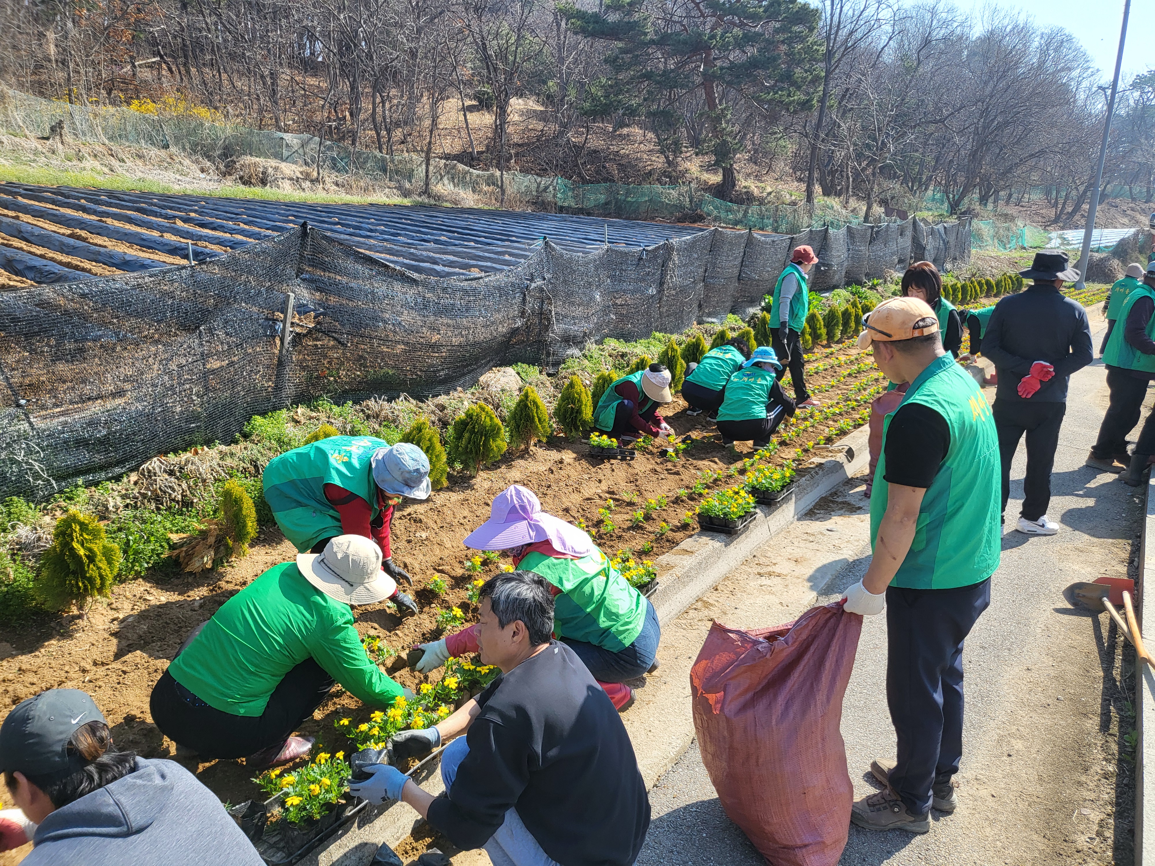 이날 37명의 교동면 새마을지도자협의회 회원들은 이른 아침부터 봉소리 인근 도로변에 메리골드와 베고니아 4,000여 본을 식재했다.