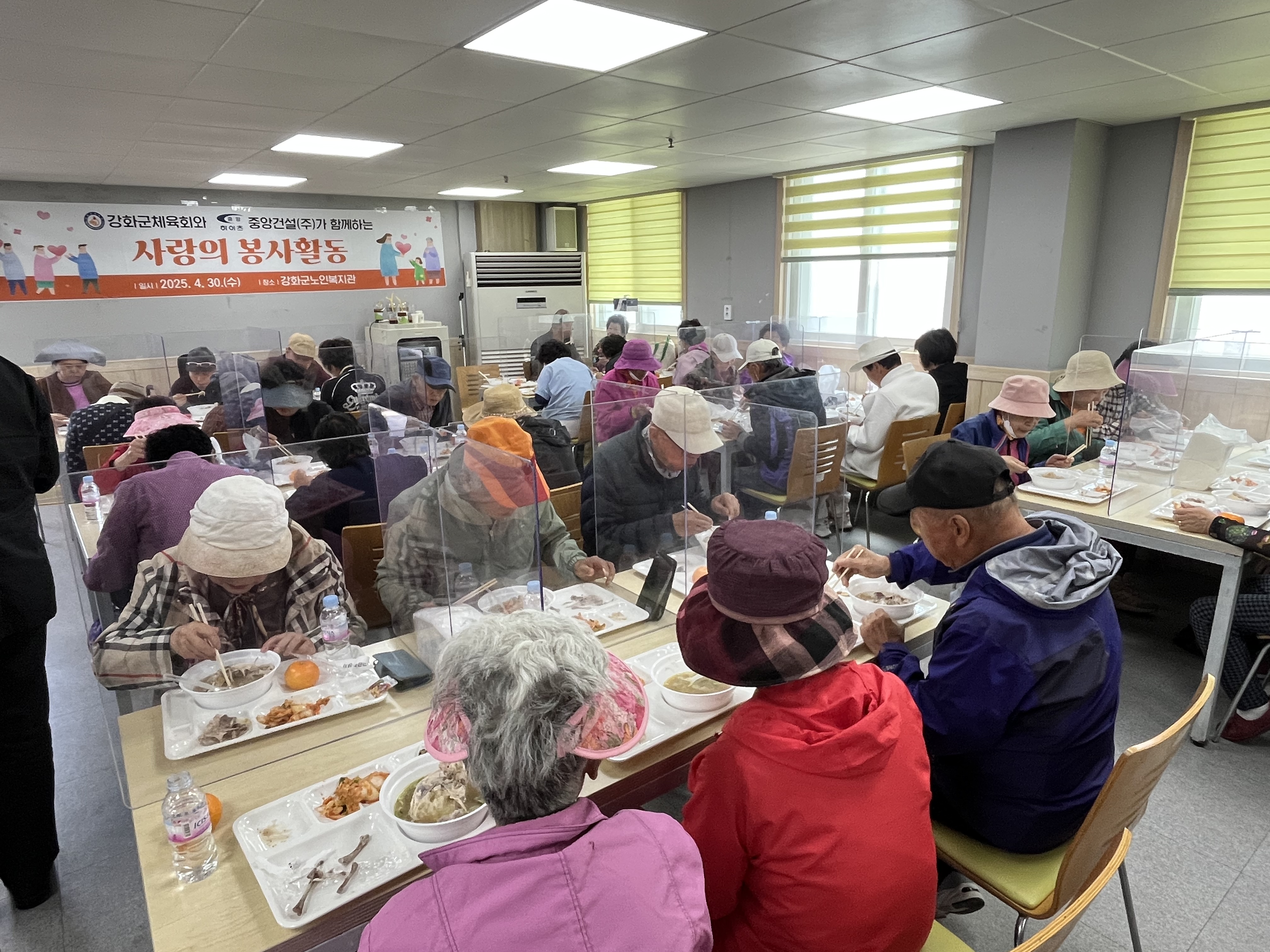 강화군노인복지관(관장 윤심)이 지난 30일 노인복지관에서 강화군체육회(회장 박영광), 중앙건설(주) 중앙하이츠와 연계해 복지관 회원 및 취약계층 어르신 200명을 대상으로 ‘건강한 행복 나눔, 삼계탕 데이!’를 진행했다.