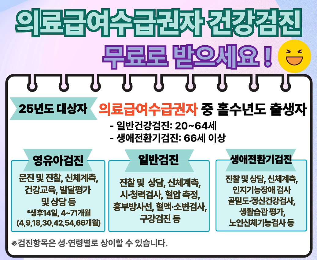 건강검진은 의료수급권자의 연령에 따라 영유아 검진, 일반 검진, 생애전환기 검진으로 나뉜다.