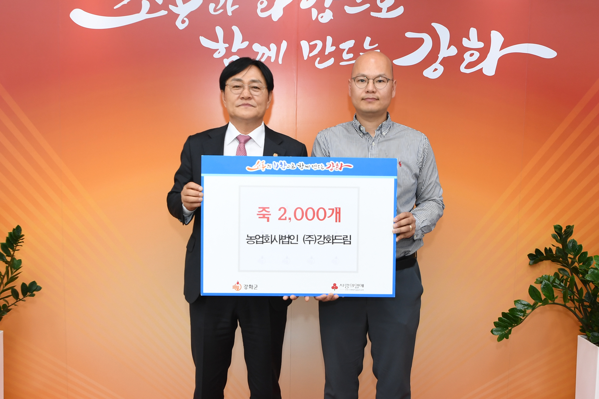 강화군(군수 박용철)은 농업회사법인 ㈜강화드림이 지난 8일 지역 내 어려운 이웃들을 위해 영양죽 2,000개(670만 원 상당)를 강화군에 기탁 했다고 밝혔다.