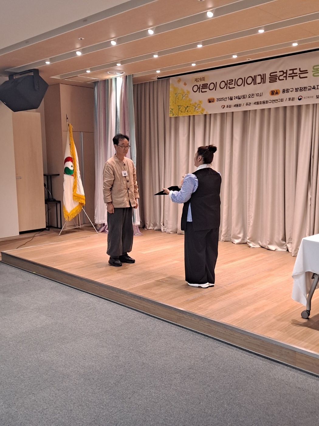 강화군 행복센터(센터장 황순길)는 지난 24일, 방정환교육지원센터에서 개최된 「제28회 어른이 어린이에게 들려주는 동화구연대회」에서 센터의 동화 구연 지도사반(지도 강사 권효순) 수강생 김광수 씨가 대상을 받았다고 밝혔다.