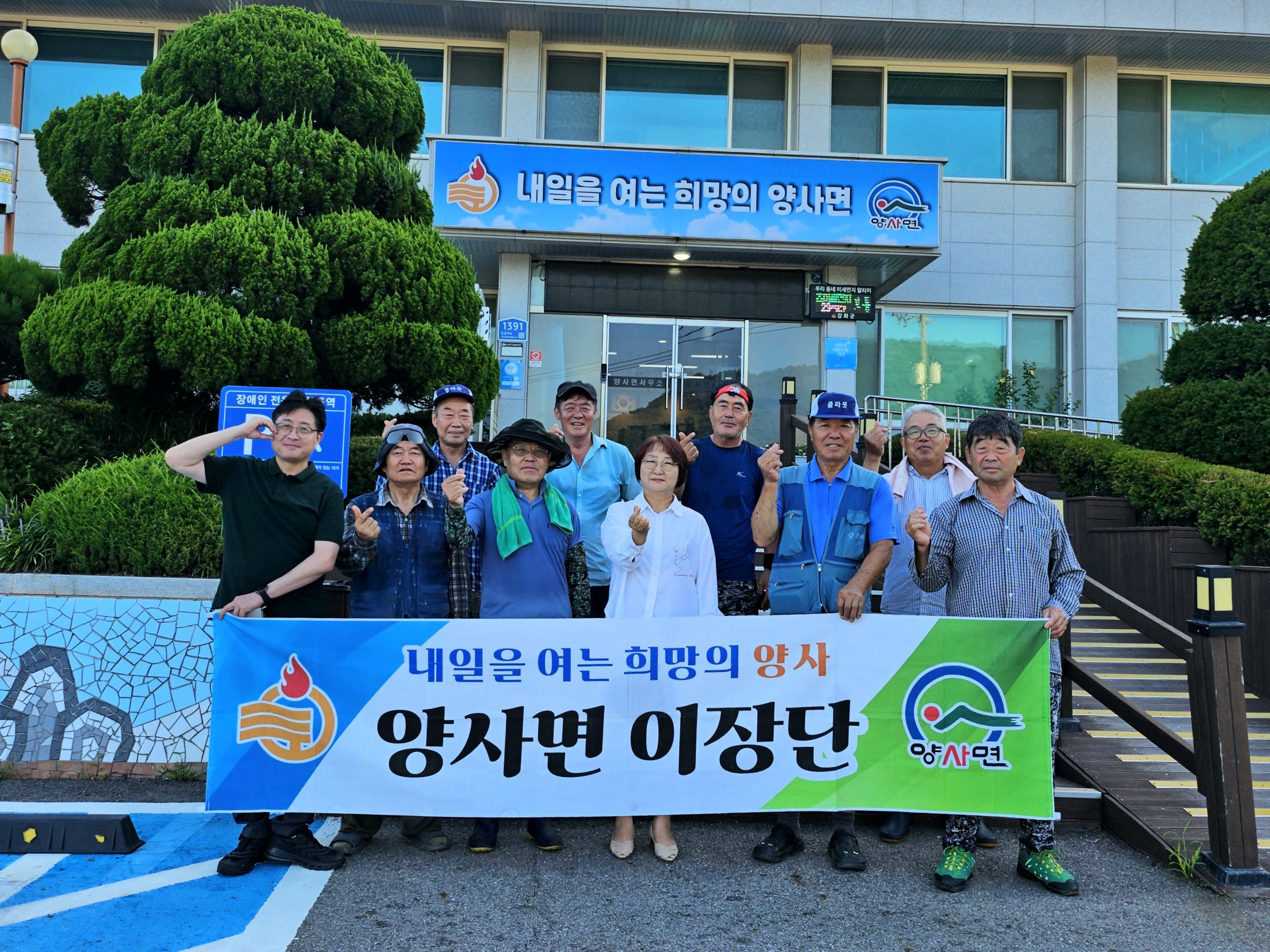 이지영 양사면장은 “무더운 날씨에도 불구하고 깨끗하고 아름다운 마을을 만들기 위해 제초 작업과 환경정화 활동에 적극적으로 참여해 주신 이장님들께 진심으로 감사드린다”고 인사를 전했다.
