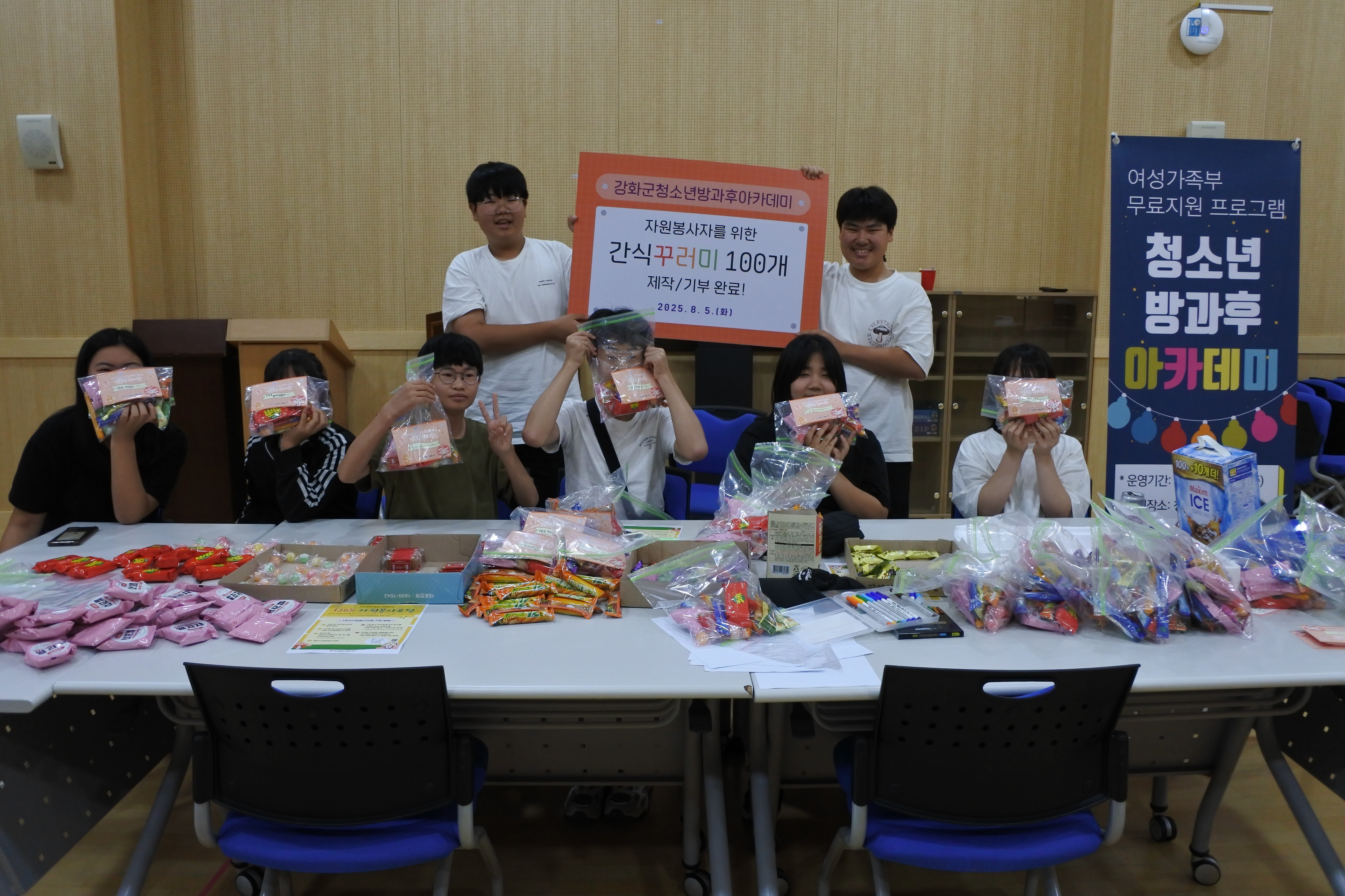 강화군 청소년방과후아카데미는 지난 5일, 아카데미 참여 청소년들이 자원봉사자를 위한 간식 꾸러미 100개를 직접 만들어 인천광역시자원봉사센터에 기부했다고 밝혔다.