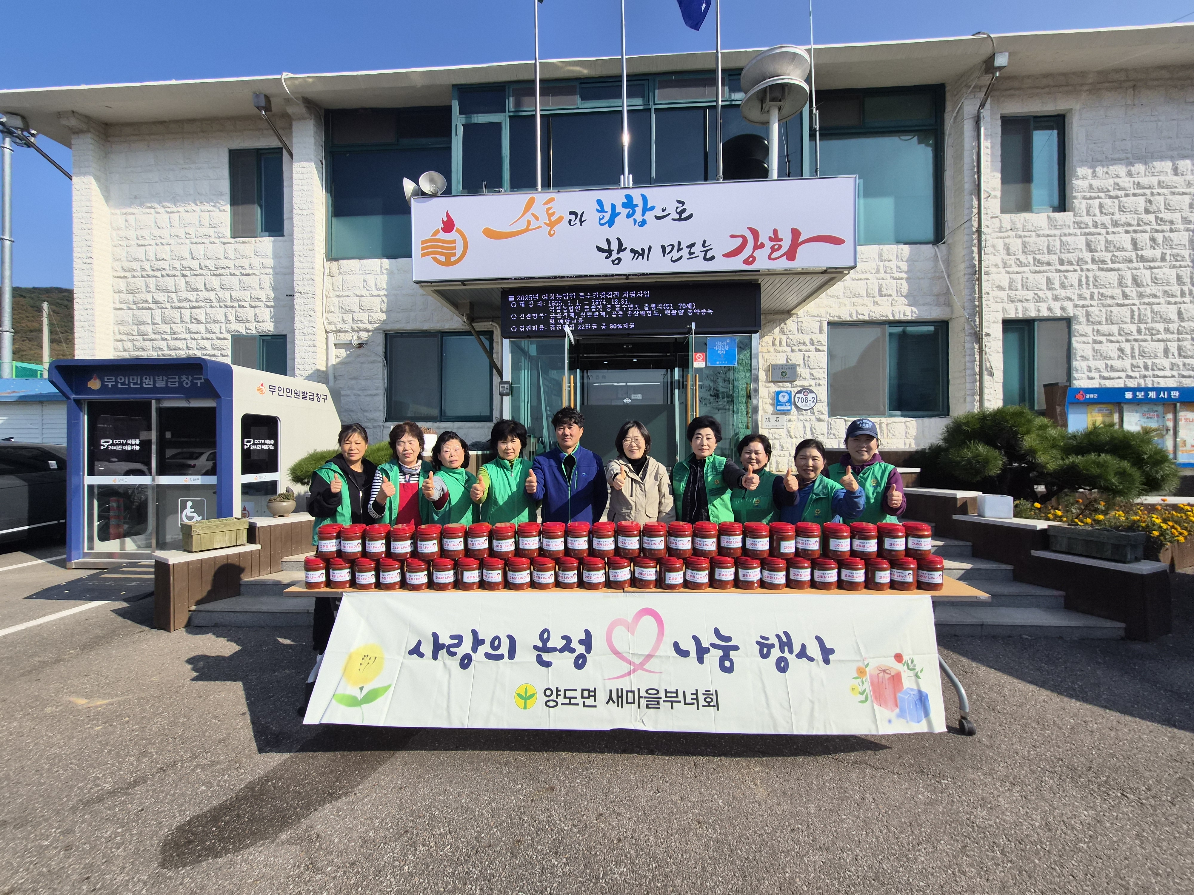 강화군 양도면 새마을부녀회(회장 김애경)가 지난 4일, 관내 어려운 이웃을 위한 ‘사랑의 고추장 나눔’ 행사를 진행했다.