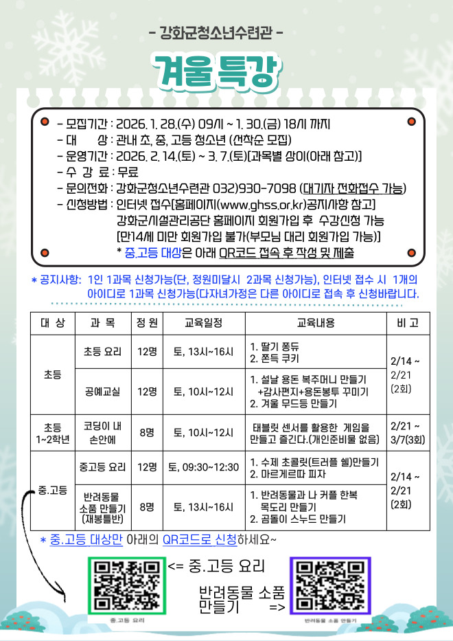 강화군청소년수련관이 오는 28일~30일, 겨울방학을 맞아 겨울 특강 참가자를 모집한다.