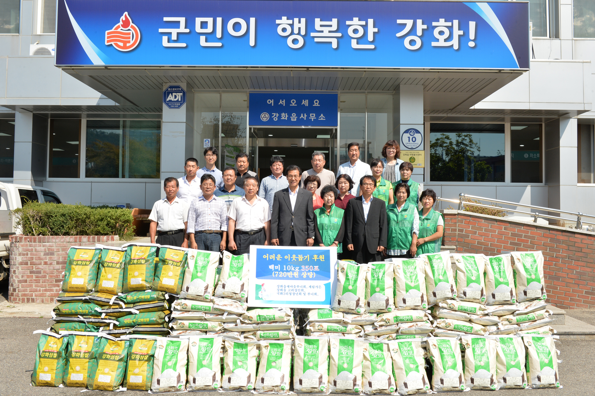 이번 기증 행사는 여러 단체가 성금을 모아 따스한 도움의 손길을 전해 총 4개 단체에서 720만원 상당의 백미 10kg 350포를 전달했다. 강화읍새마을부녀회(회장 이임순)에서 백미 10kg 60포, 고려상인연합회(회장 박병오)에서 백미 10kg 110포, 국화2리 청장년회 및 새마을부녀회(이장 문상위, 부녀회장 김상녀)에서 백미 10kg 110포를 기증했으며, 계림가든(대표 소귀상)에서 백미 10kg 70포를 기증했다. 기증된 쌀은 저소득층과 홀몸노인 가정 등 350가구에 강화읍사회복지위원회(위원장 김용우) 회원들과 함께 한가위 명절 전에 전달할 계획이다.