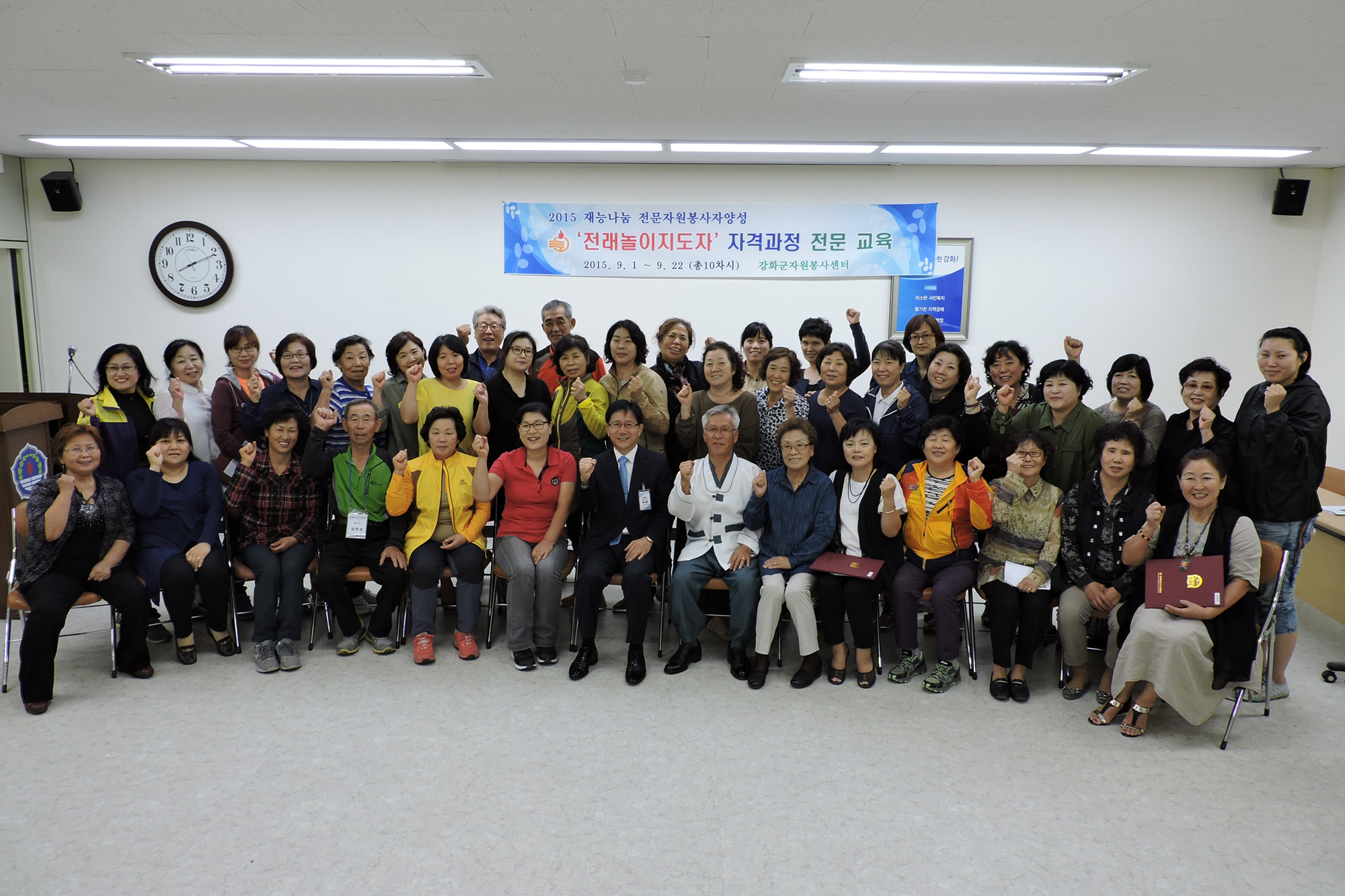 강화군자원봉사센터(소장 구본효)는 국제평생교육개발원(원장 이광재)과 자원봉사 업무협약을 맺고, 지난 1일부터 22일까지 총 10차에 걸쳐 강화군 관내 자원봉사자를 대상으로 전문자원봉사자 양성 ‘전래놀이지도자 자격취득’ 과정 교육을 실시하고 수료식을 가졌다.