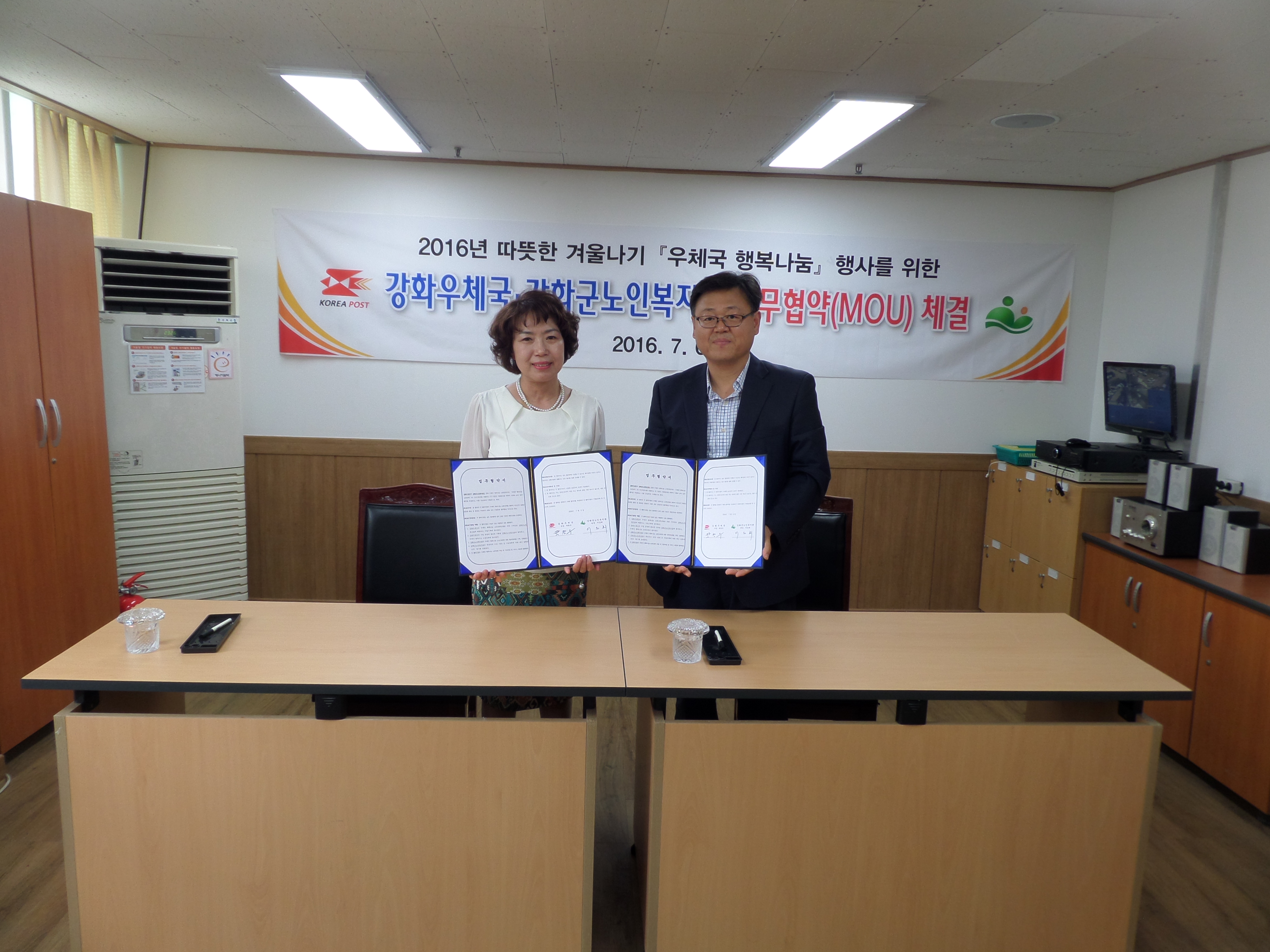강화군노인복지관과 강화우체국은 지난 6일 강화군 지역에 거주하는 저소득(독거)노인에게 정서적·경제적인 서비스를 더욱 효과적으로 제공하기 위해 ‘2016년 우체국 행복배달부 지원 사업’에 대해 업무협약을 체결했다.