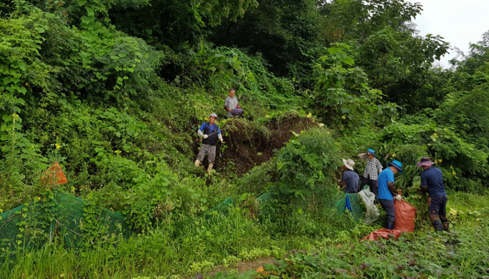 (사진: 군 관계자가 생태교란식물 제거 작업에 한창이다)