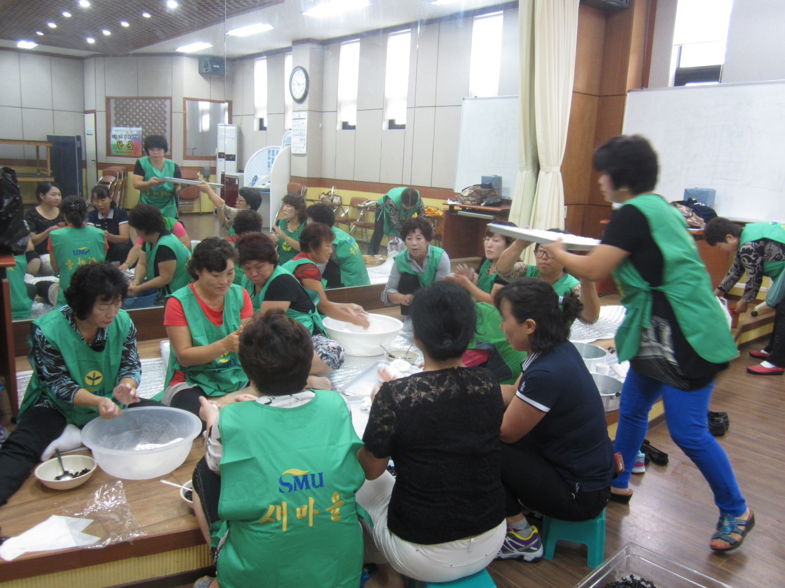 (사진: 삼산면 새마을부녀회에서 송편 만들기에 한창이다.)