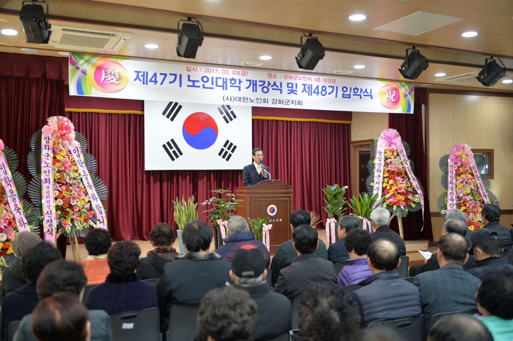 (사)대한노인회강화군지회는 지난 3일 강화군노인복지관 대강당에서 2017년 강화노인대학 제47기 개강식 및 제48기 입학식을 가졌다.