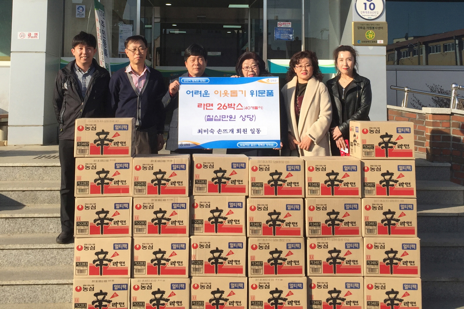 이날 행사는 강화읍 뜨개방 동아리(회장 황정애) 회원들이 작품전시회를 통해 얻은 수익금으로 70만원 상당의 라면 26박스를 기탁해 이루어졌으며, 위문품은 저소득 취약계층과 독거노인, 위기가구 등에 전달될 예정이다.