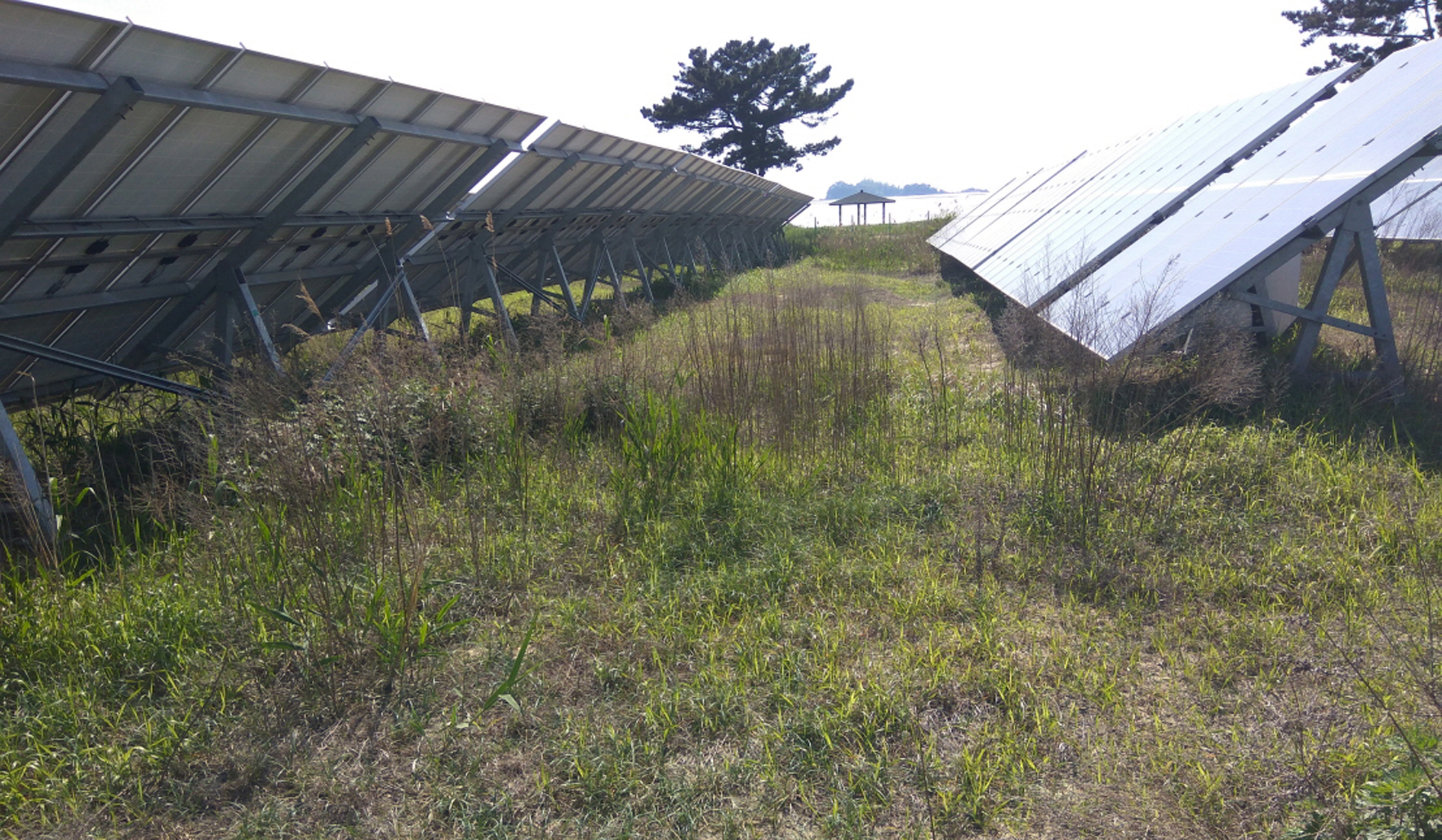 (사진: 2013년 서도면 주문도리 429-1번지 해안가에 설치된 태양광 발전시설 주변에 풀이 무성하게 자라있다)