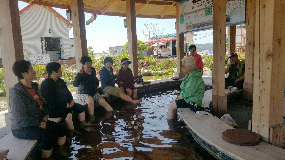 (사진 1매) 도란도란 회원들이 족욕 체험을 하고 있다.
