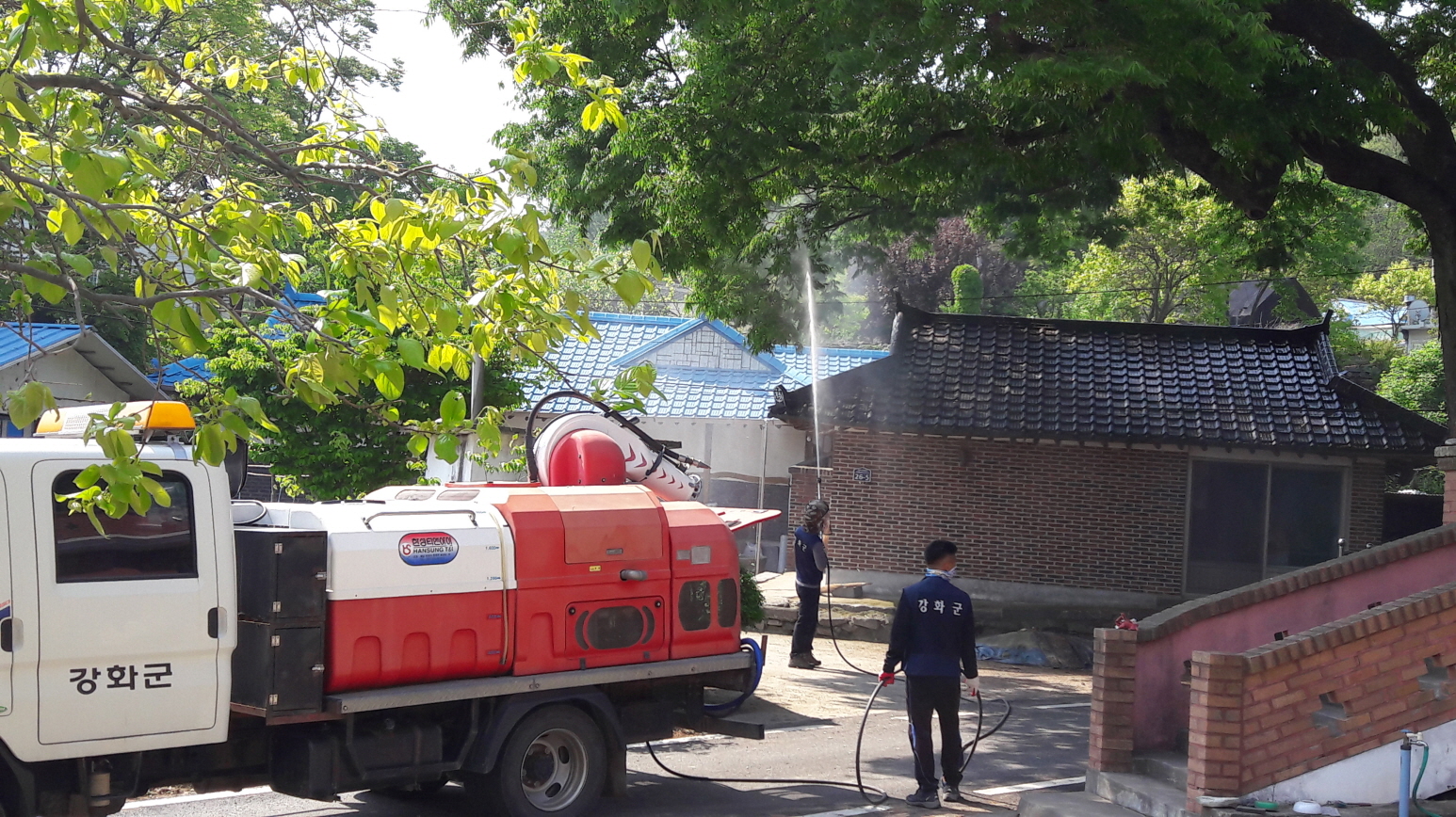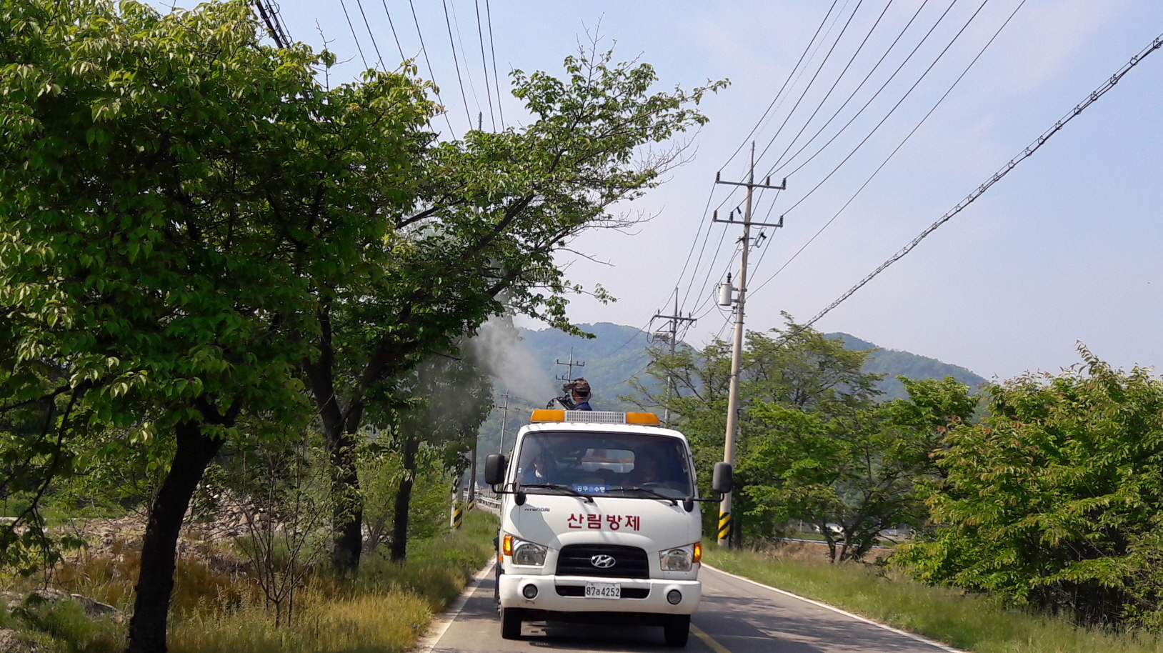 (사진 2매) 군 직영방제단이 마을을 돌며 병해충 방제에 나서고 있다