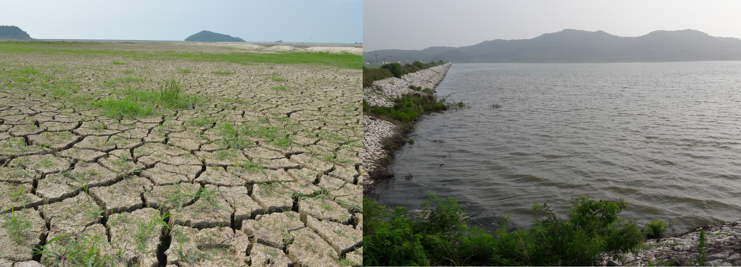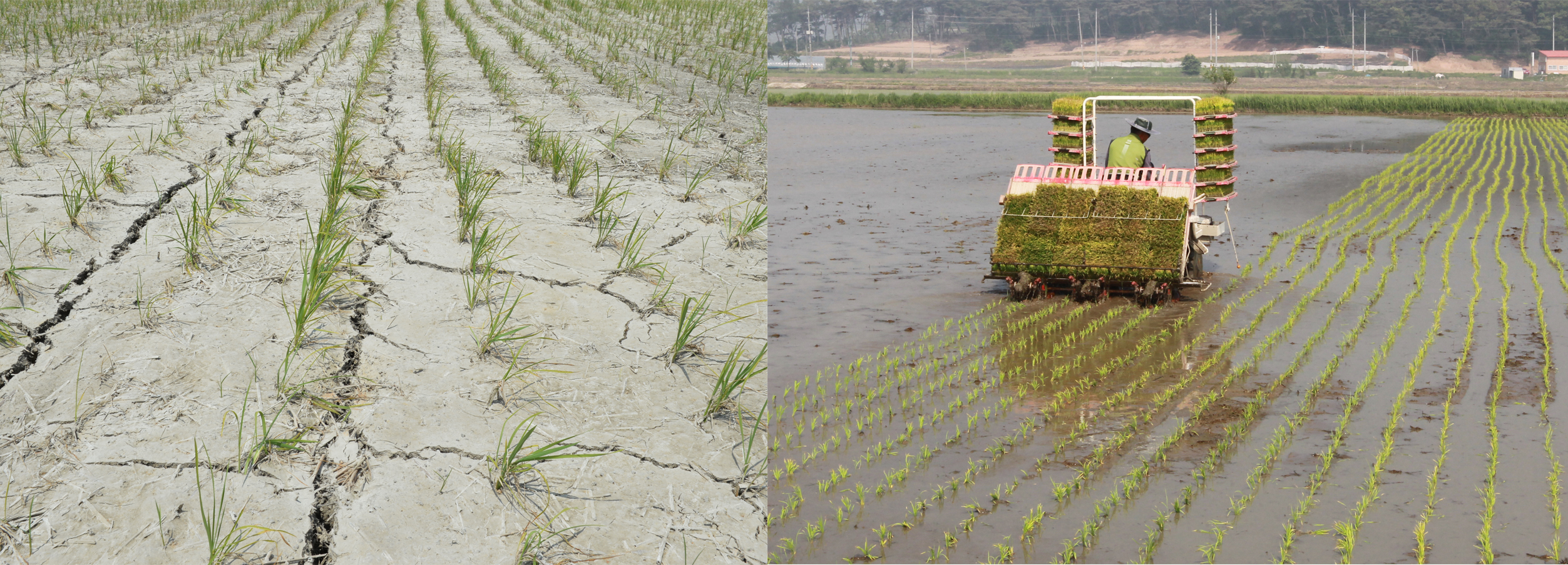 2. 2015년 극심한 가뭄에 시달리던 논(좌측)과 2017년 충분한 농업용수로 모내기 중인 논(우측)