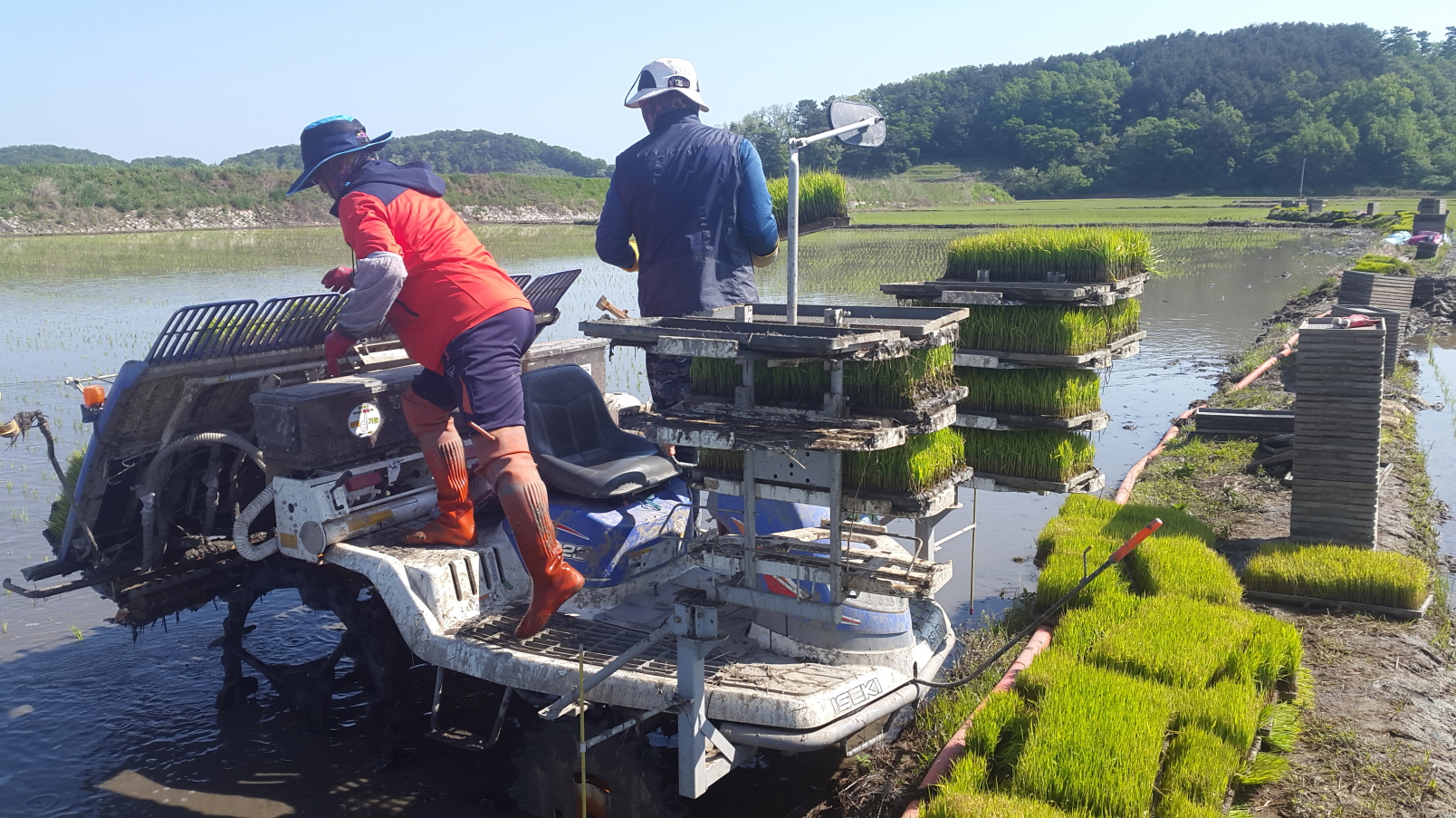 이러한 딱한 사정을 접한 인천 서강화농협 이갑상, 유인상, 황순일 이사가 또다시 의기투합해 지난번 논갈이에 이어 지난 24일부터 27일까지 3박4일에 걸쳐 본인들의 이앙기를 손수 교동면에서 옮겨와 영농조건이 안좋은 102필지 약 165,000㎡에 대해 모내기를 마쳤다.
