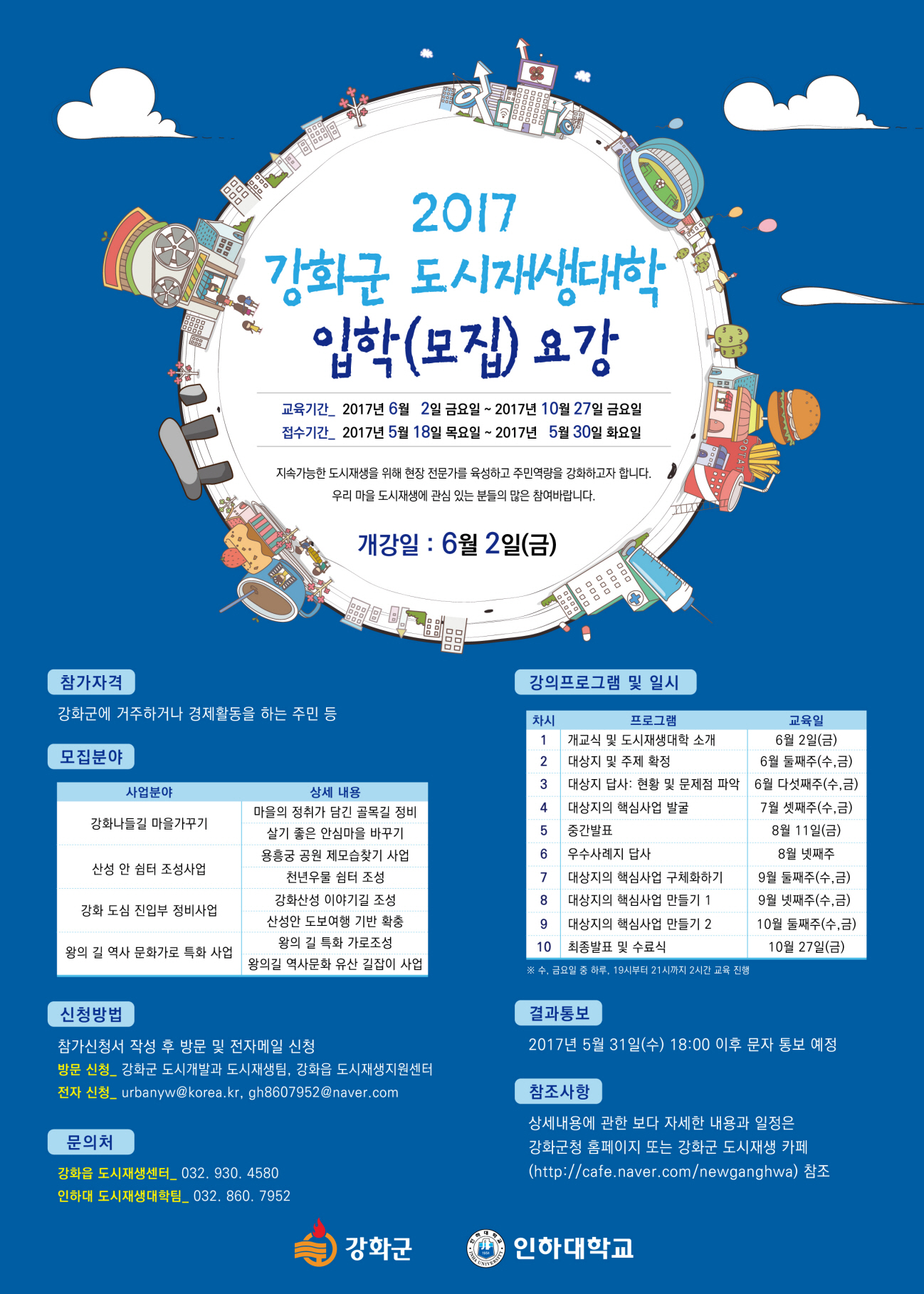 인천 강화군(군수 이상복)은 주민과 함께하는 지속가능한 도시재생을 위한 주민역량강화 프로그램인 2017 도시재생대학에 대한 수강생을 오는 30일까지 모집한다고 밝혔다.