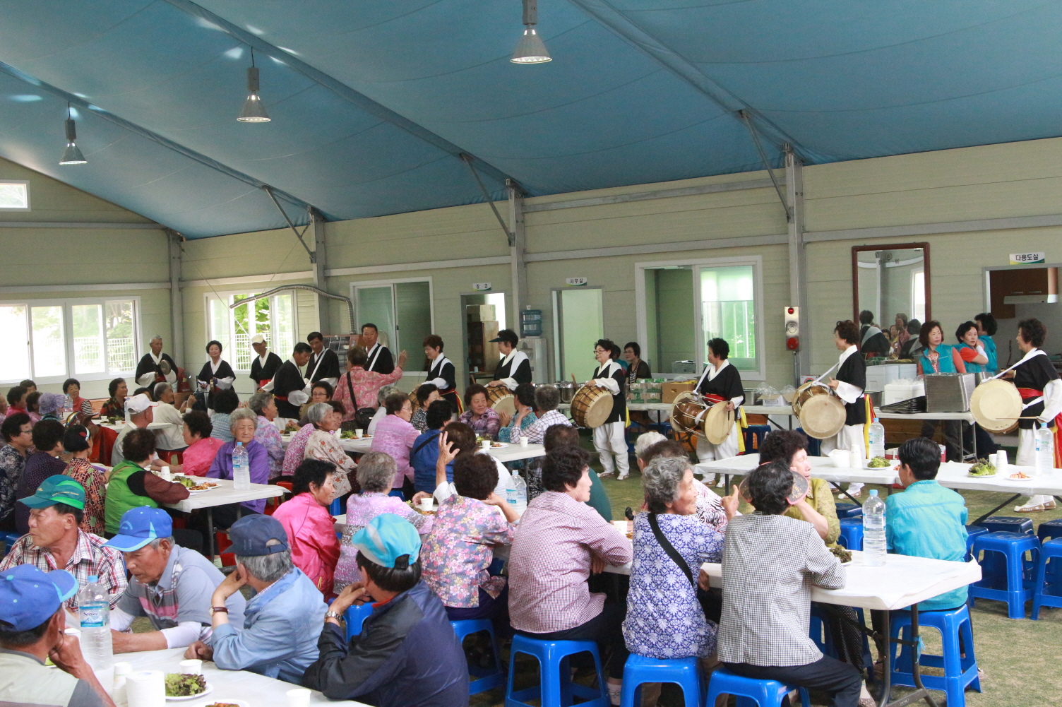 (사진: 어른신들이 풍물놀이를 보며 식사를 하고 있다)